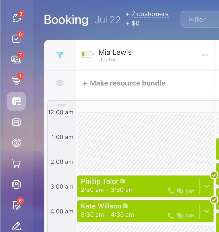 - The booking is added to the schedule, saved automatically in the CRM, and the client receives a notification with booking details.