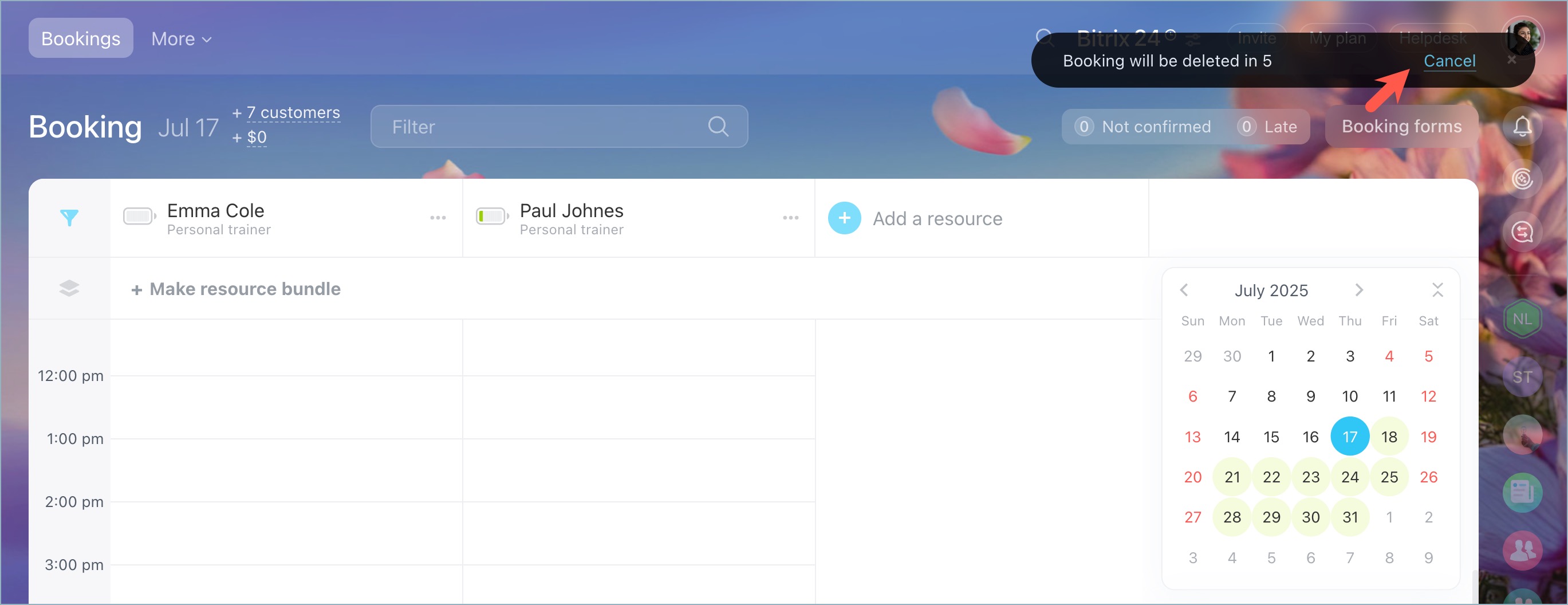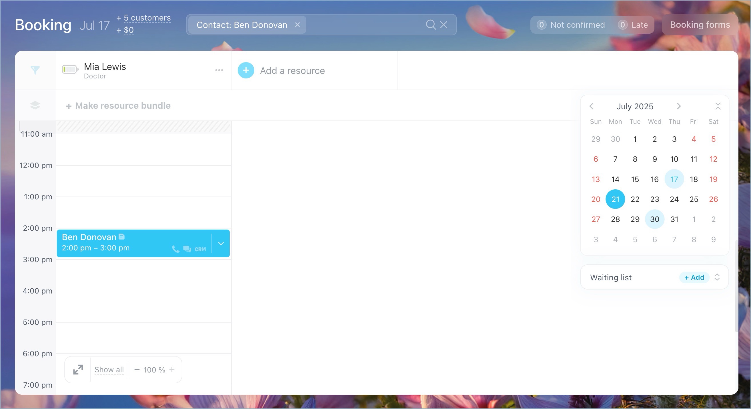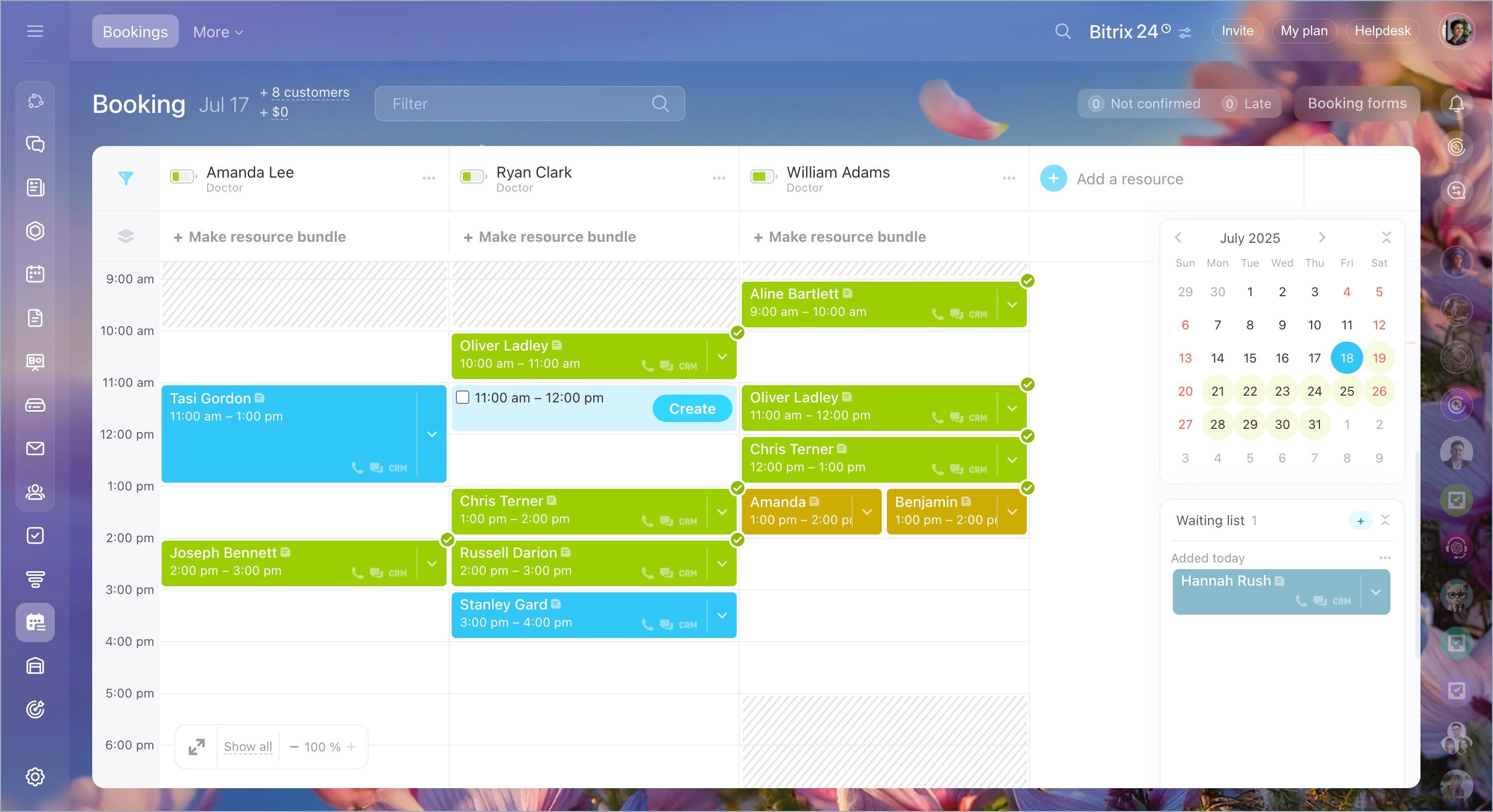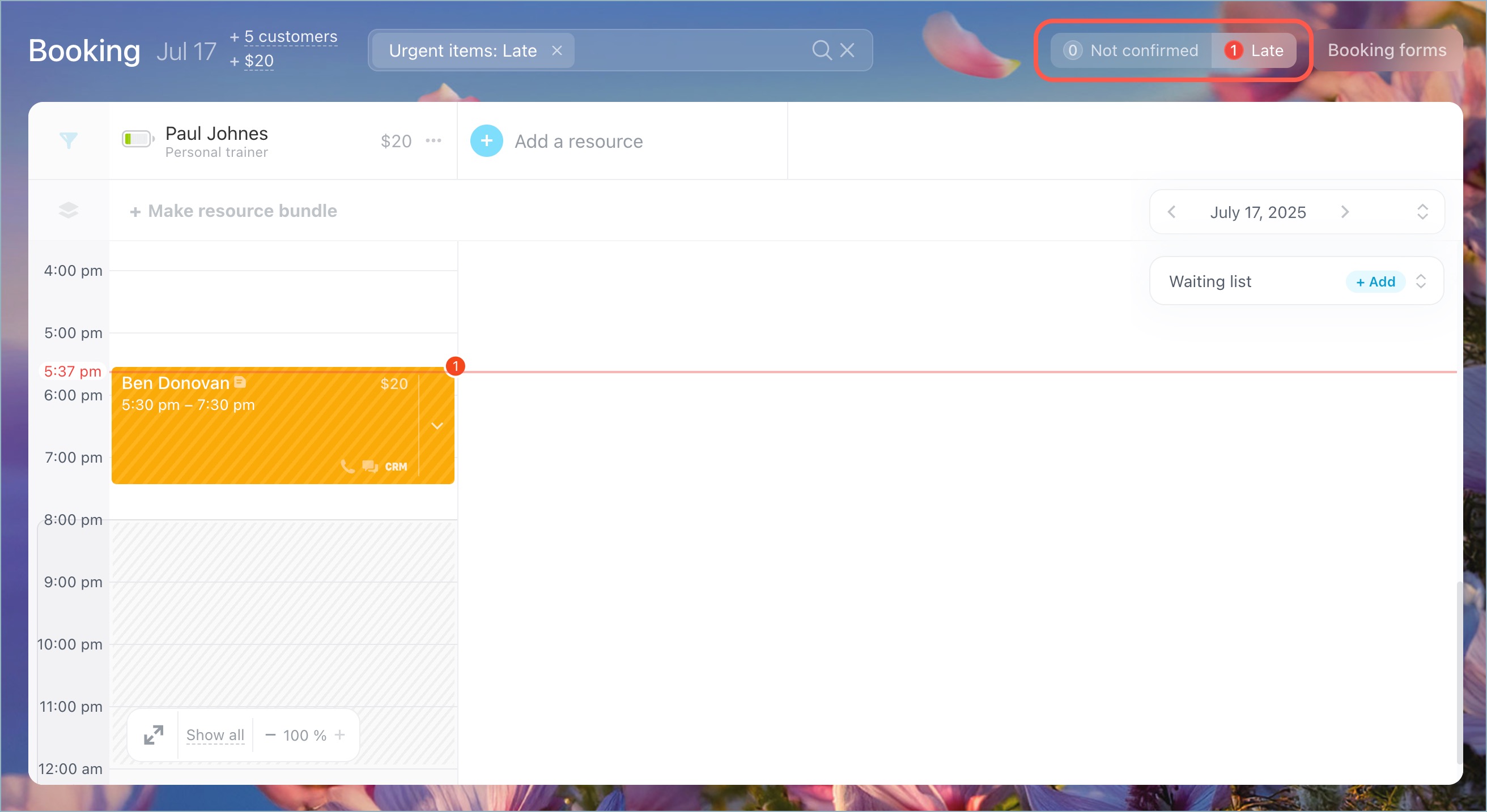 Bookings are color-coded to clearly show their statuses, such as confirmed, late, and more. This helps you and your team to navigate the schedule at a glance. -