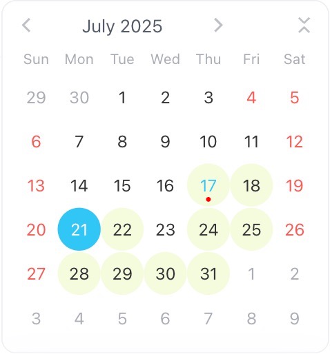 — Light blue: Dates that match the applied filter (e.g., filtered by resource).