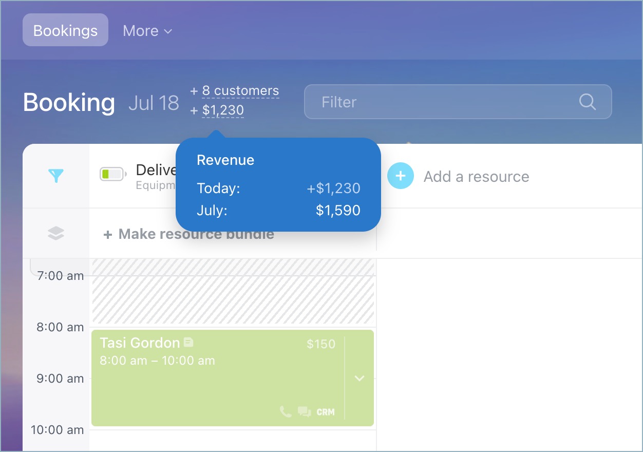 You can also check the number of new customers, revenue per resource, and the total for the day. This is based on the "Amount and currency" field in linked deals and shows data for today.