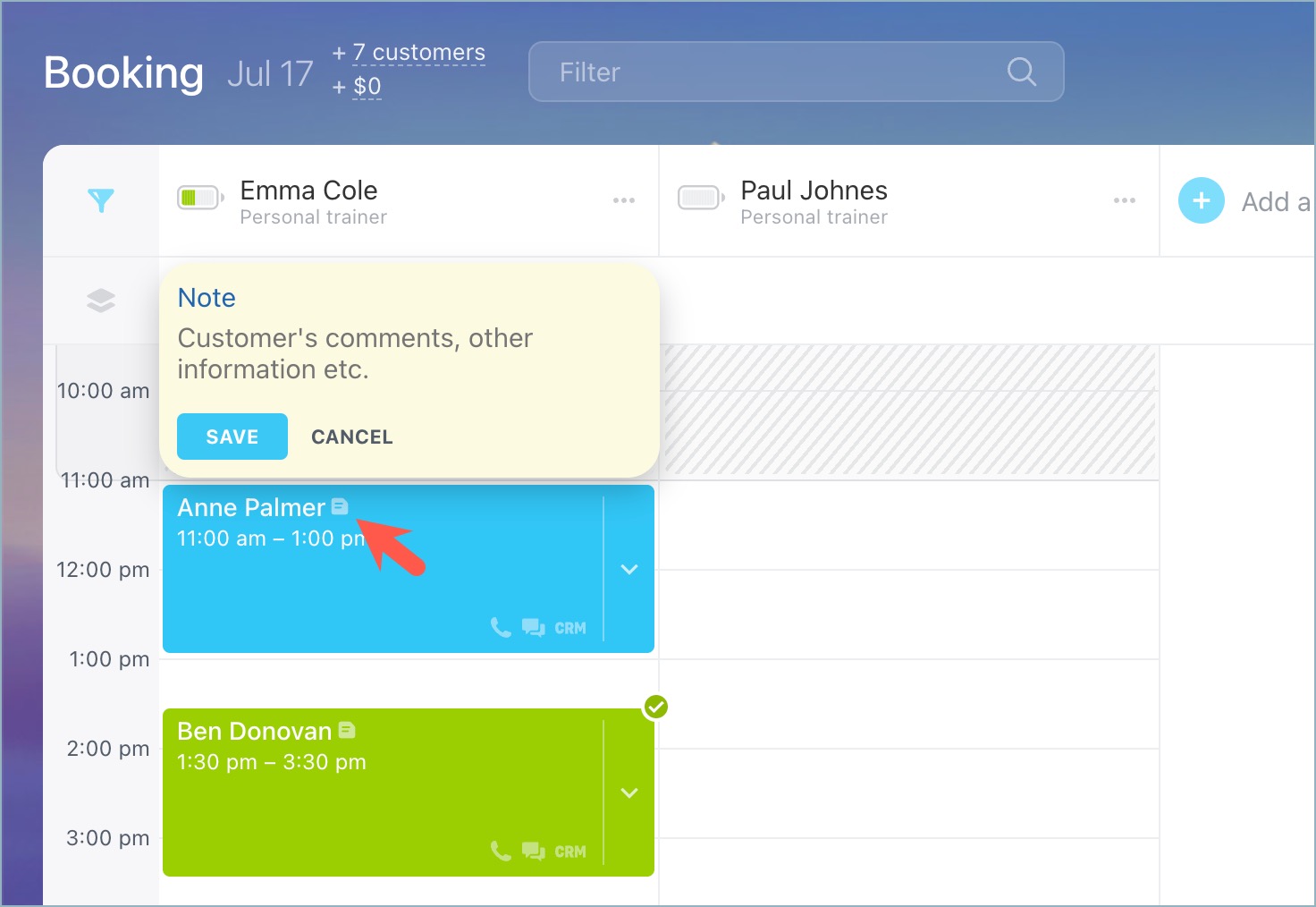 For instance, apply the "Contact" filter to view a particular customer's bookings for a specific date and highlight the days on the calendar when they have other appointments.