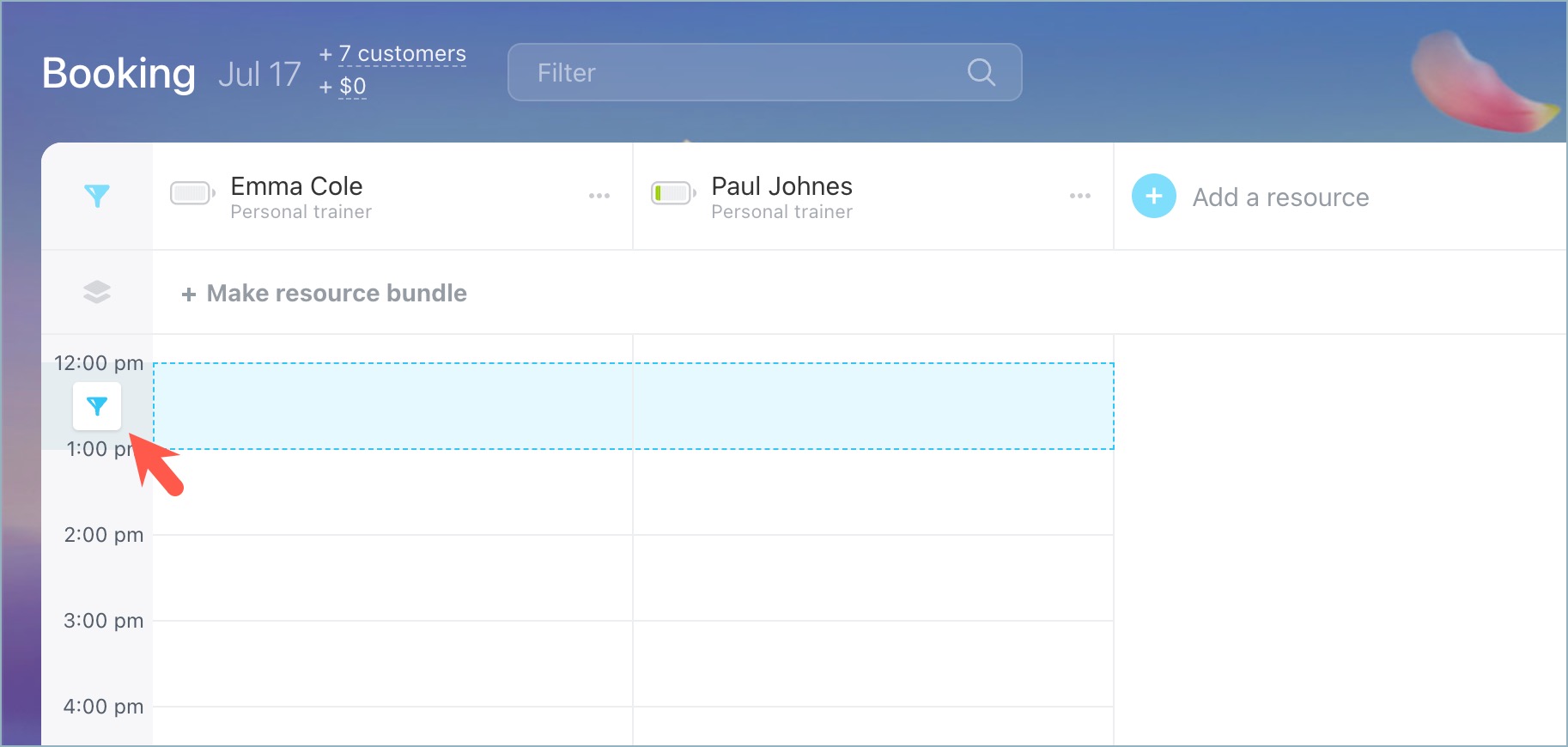 Hover over the battery icon next to a resource to see the number of booked slots and the resource's load percentage.
