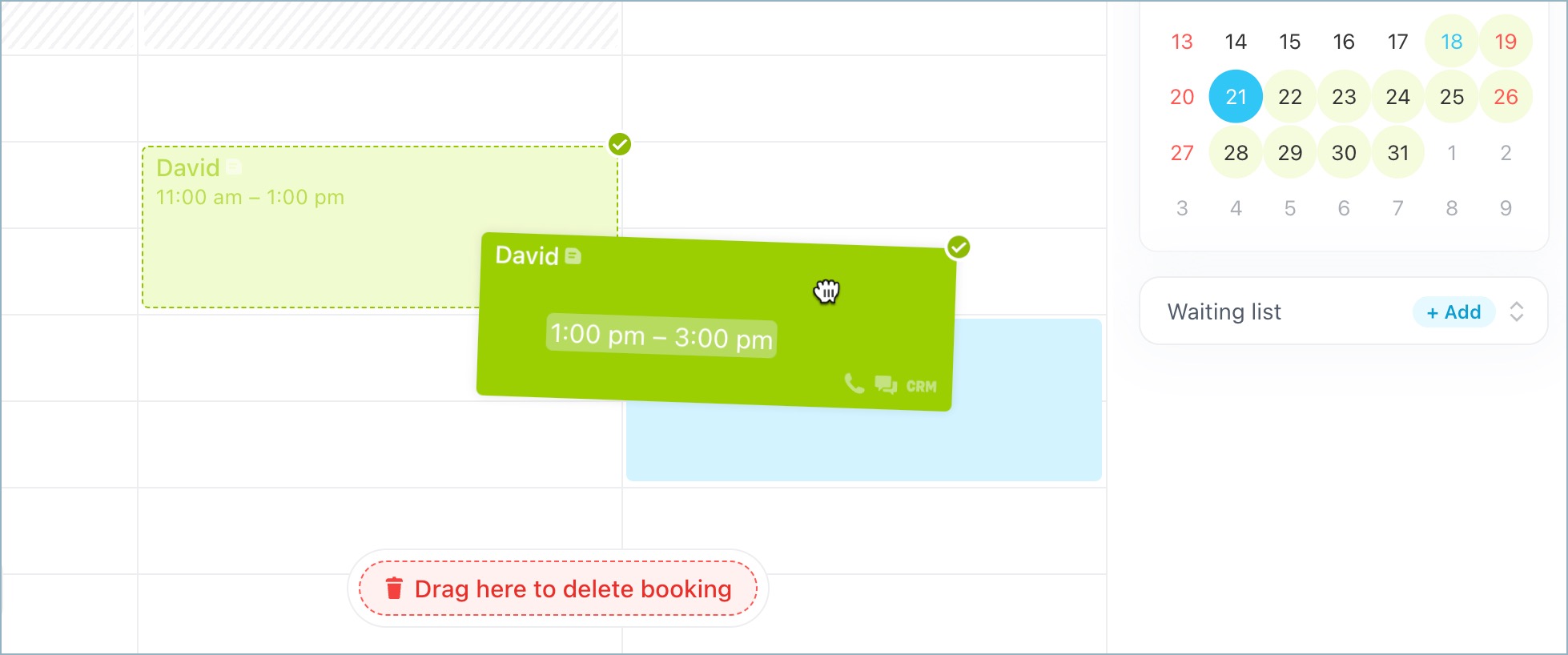 Bookings added to the waiting list are highlighted in gray.