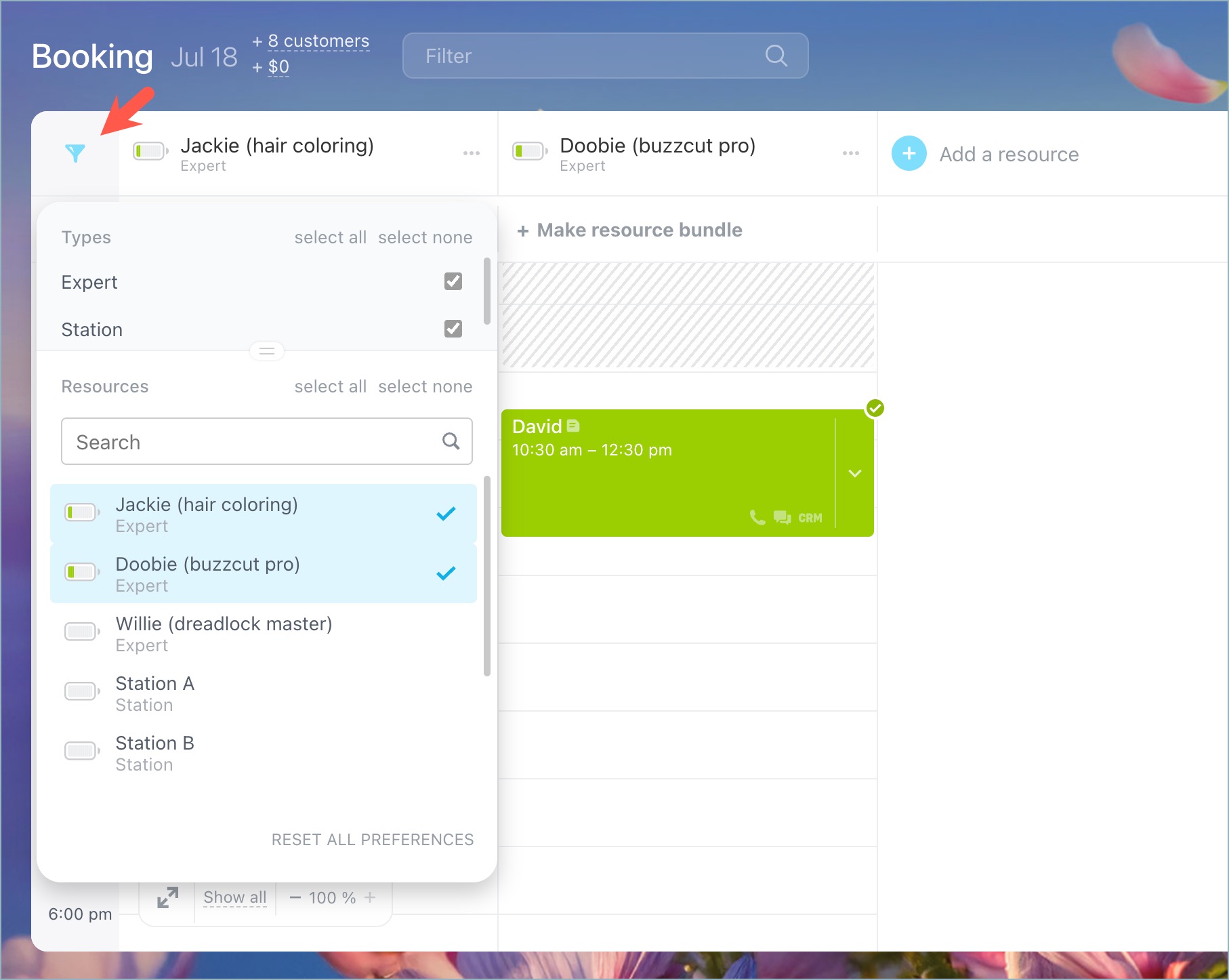 Bookings that require agent's attention are marked with special counters. Click on them to instantly filter the schedule and view only relevant bookings, such as unconfirmed or late appointments.