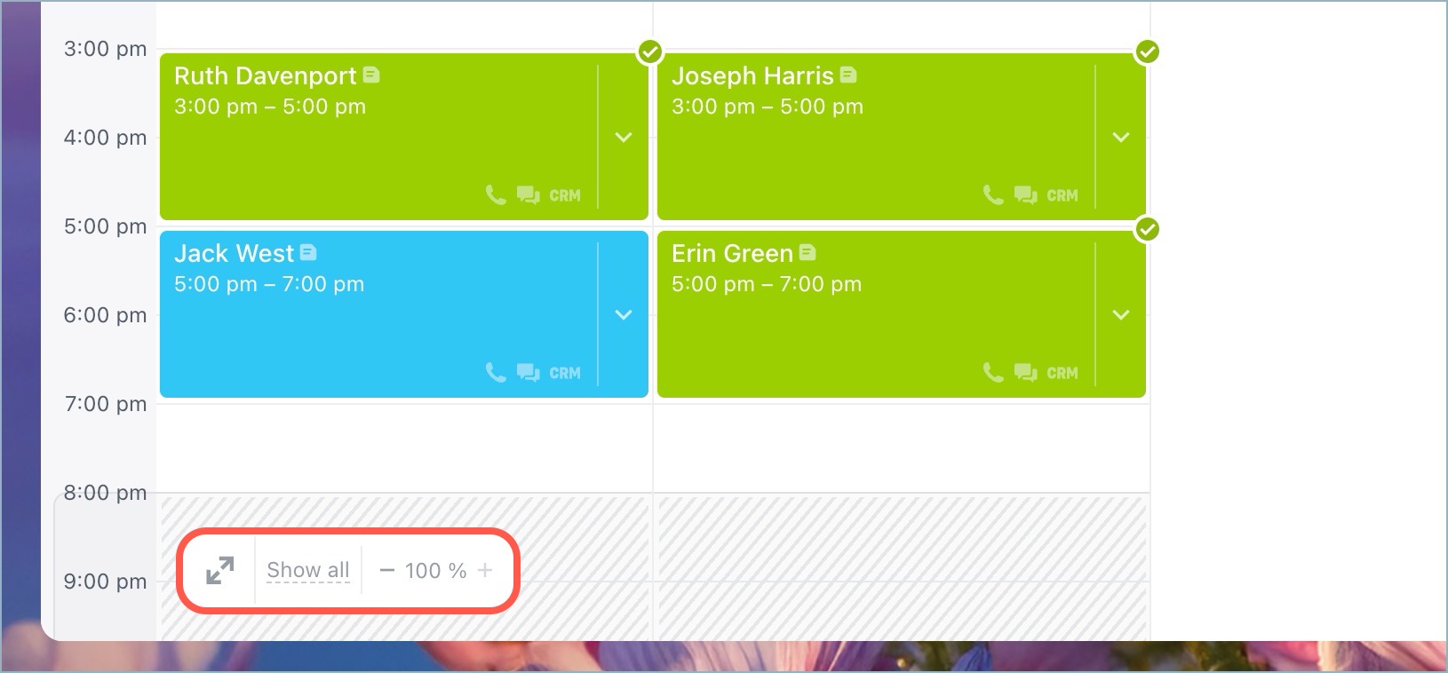 If bookings don't fit on the screen, adjust the zoom level (–100%+). Use the "Show all" button to display all resources and quickly check their usage.