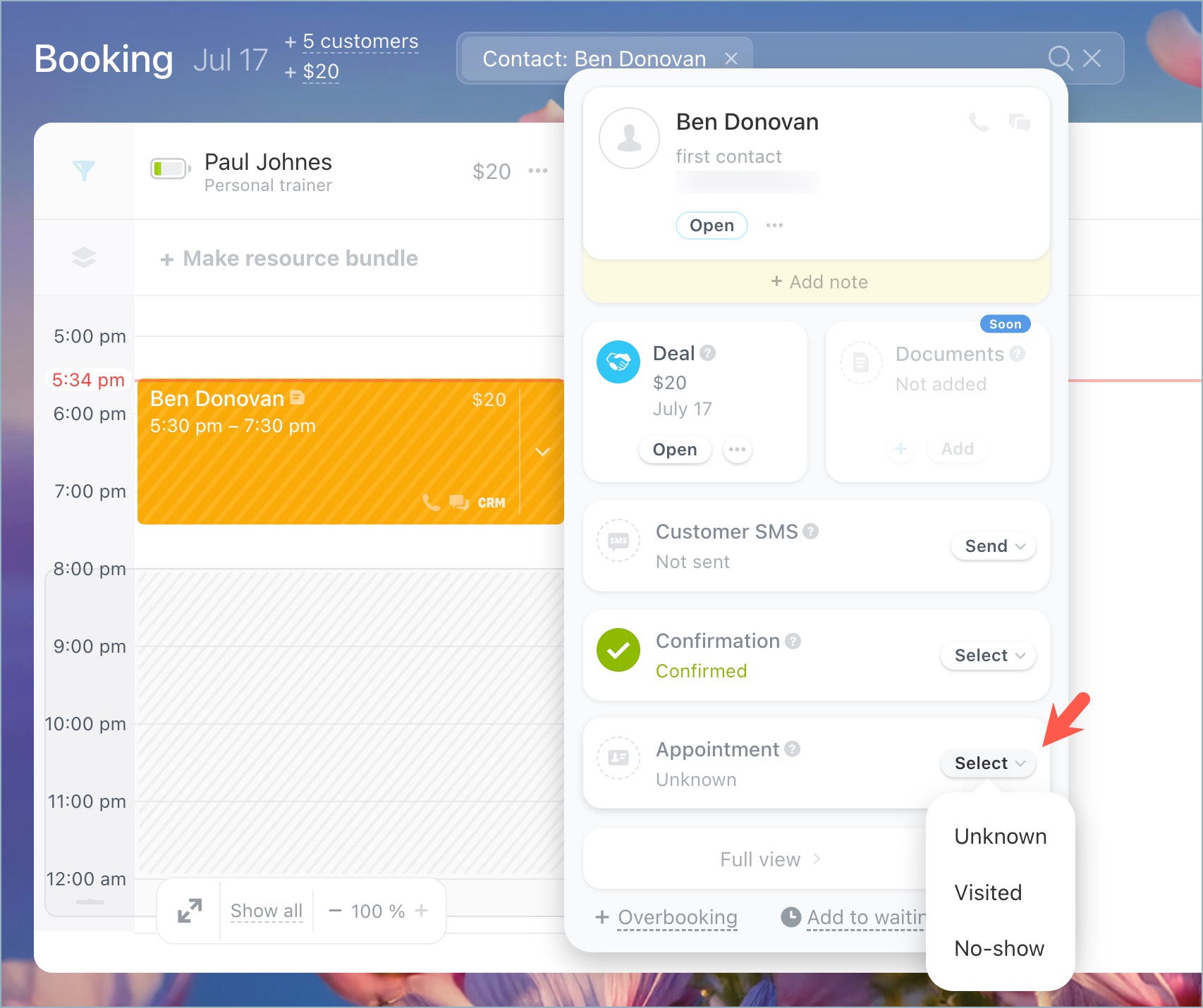 To track attendance on the schedule board, click the arrow next to the booking, select "Appointment," and mark the status as "Visited" or "No-show."