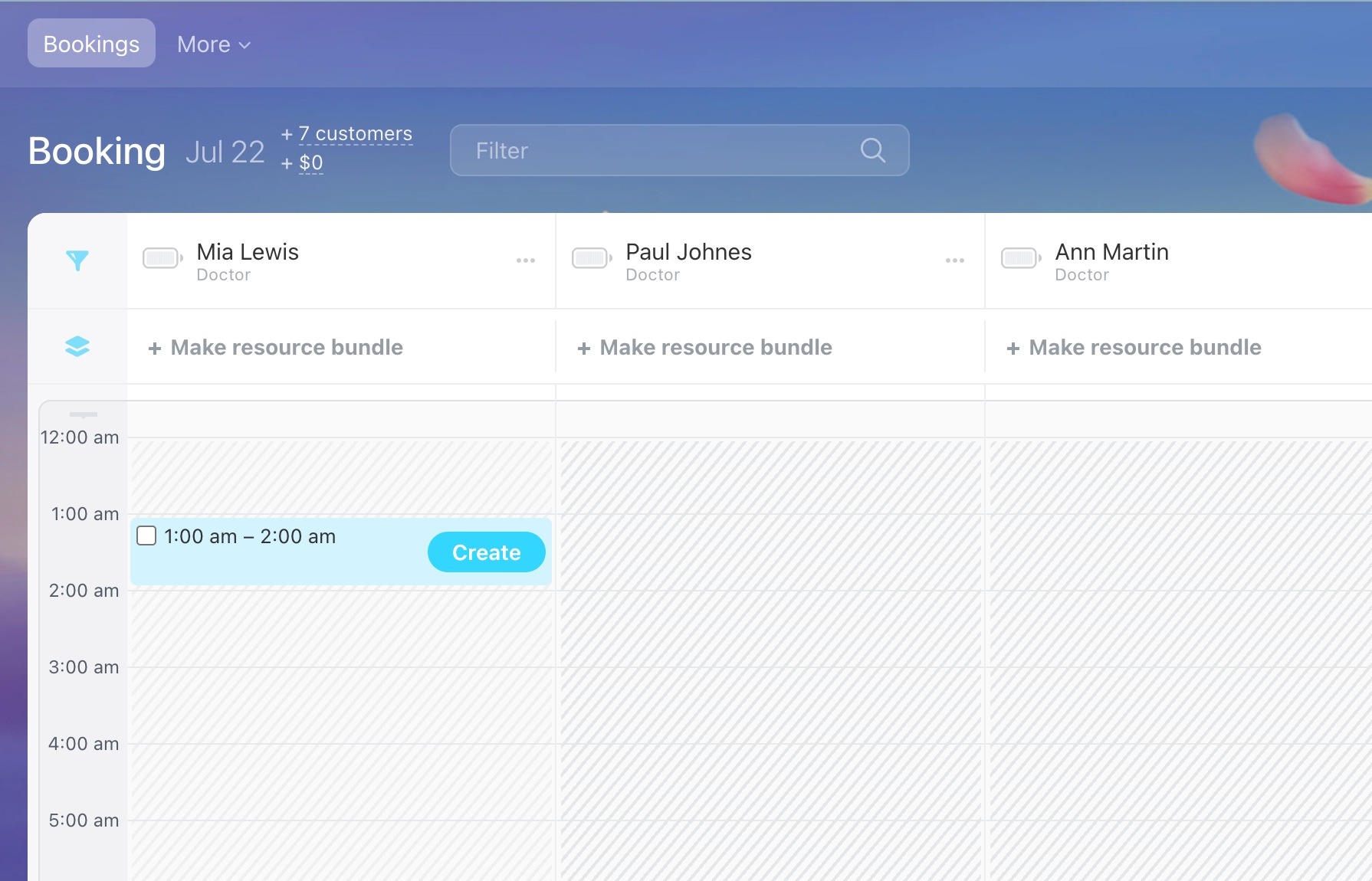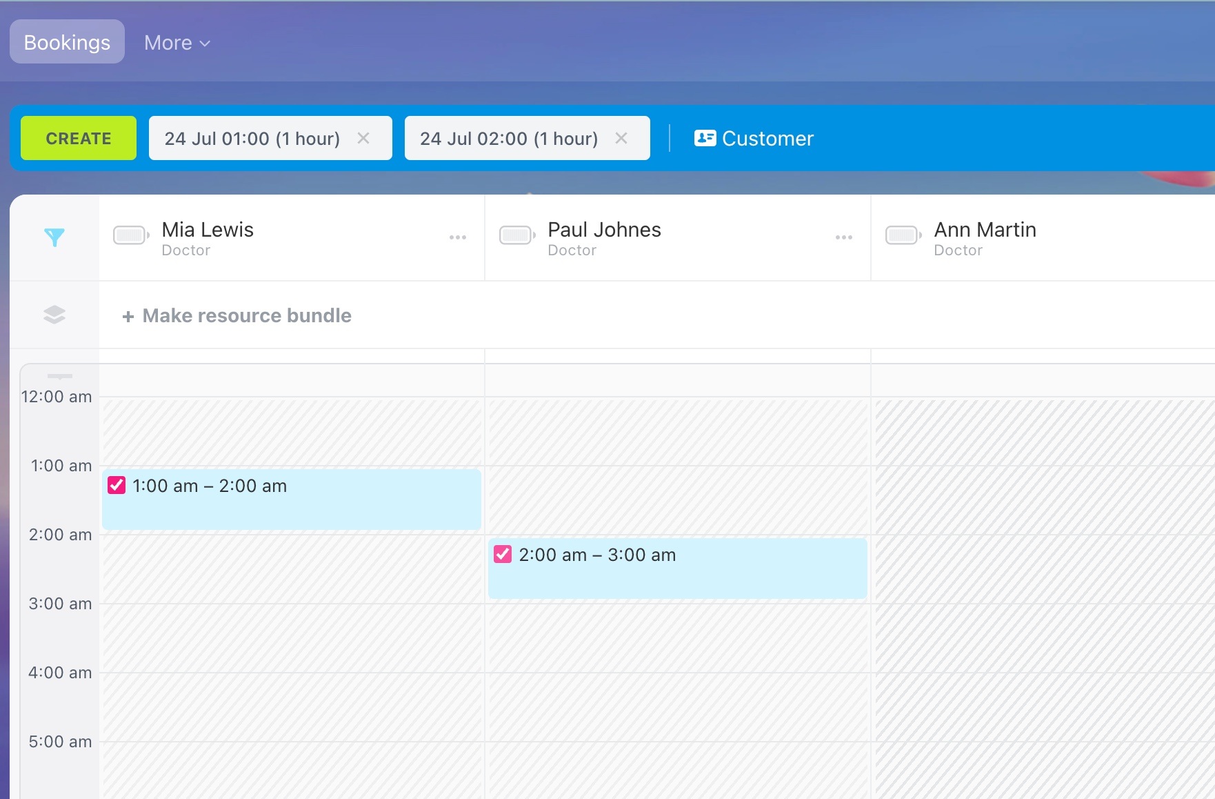 To create multiple bookings at once, select several time slots on the schedule board by checking the boxes next to them.