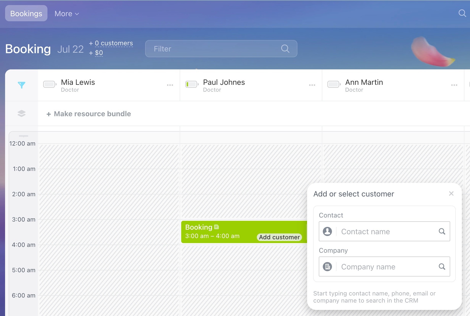 If the contact or company already exists in the CRM, add them to the booking. If not, create a new item. The data will be saved in the CRM, helping you to grow the customer base. This allows you to reach out later to offer new services or share updates.