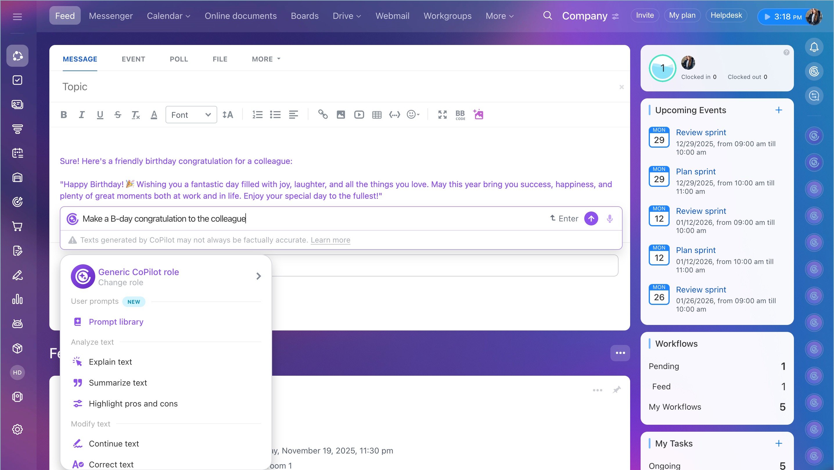 CoPilot is also available in CRM, tasks, feed, webmail, and website builder.