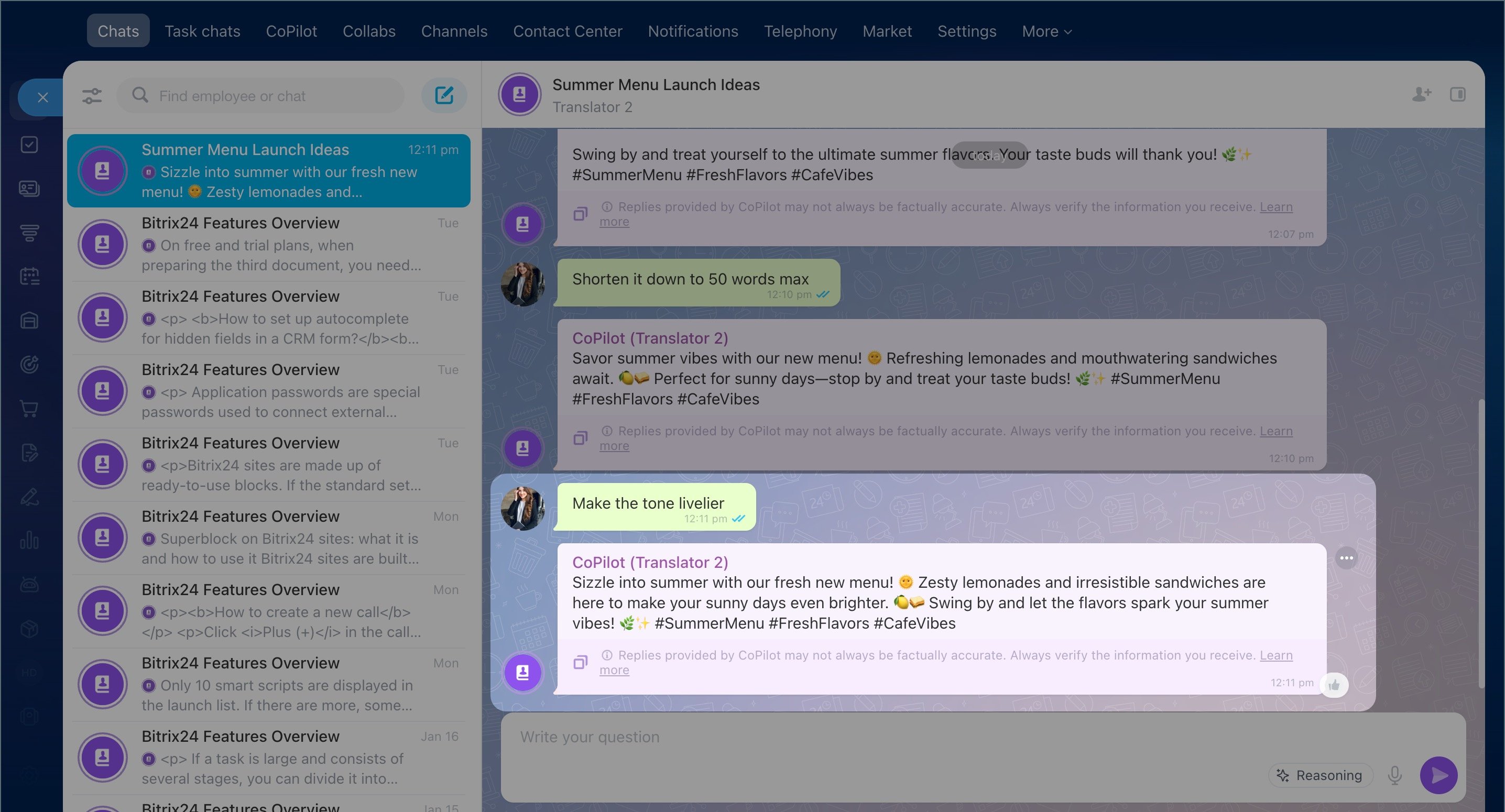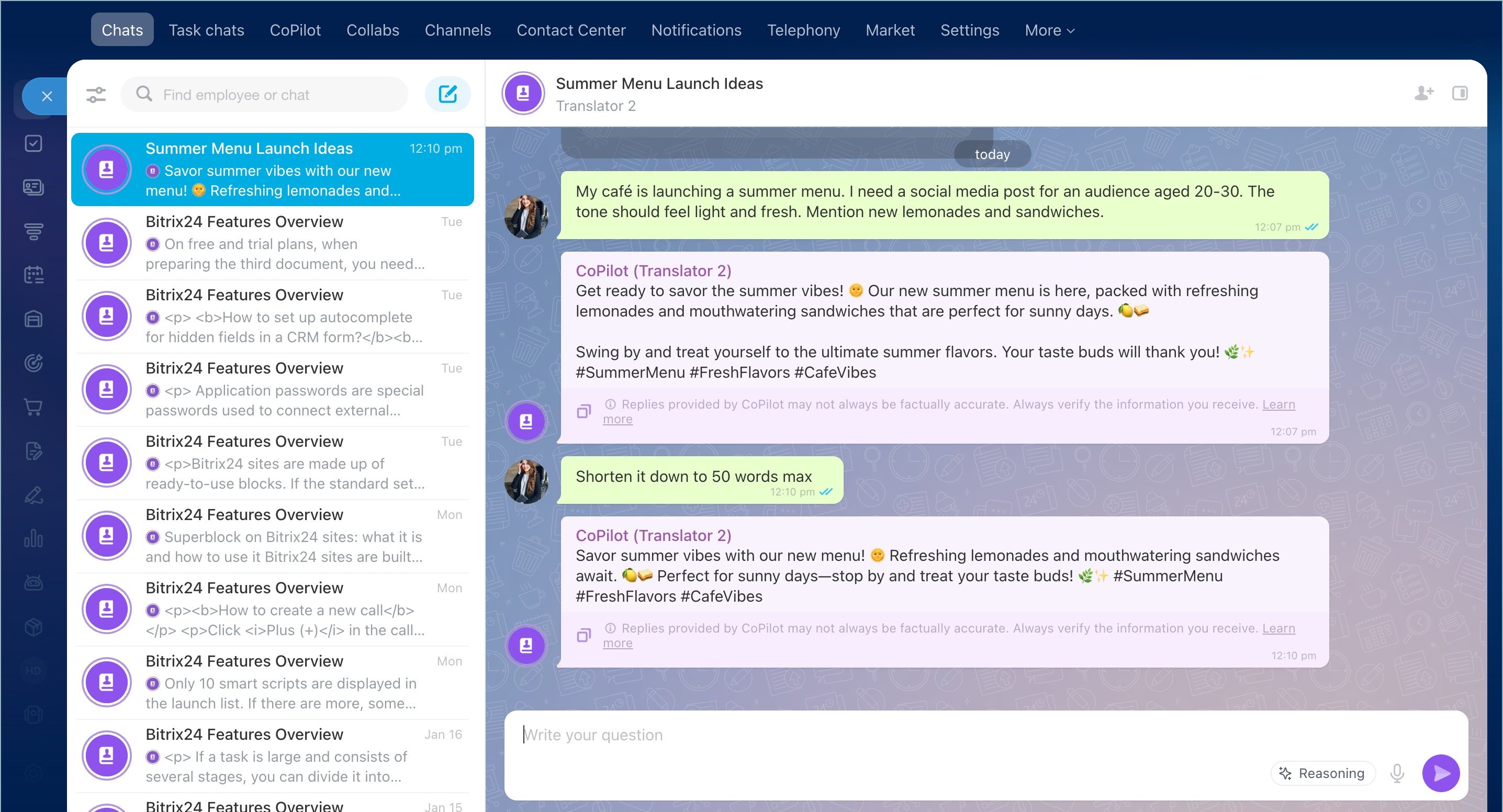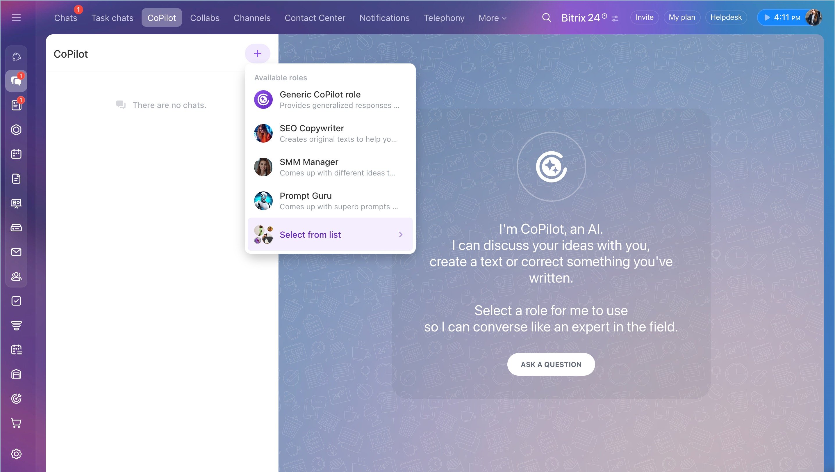 You can create custom CoPilot roles in Bitrix24 (tailored to your line of business) and share them with your team. Set up a new role in the Role Library and use it in all Bitrix24 tools where CoPilot is available.