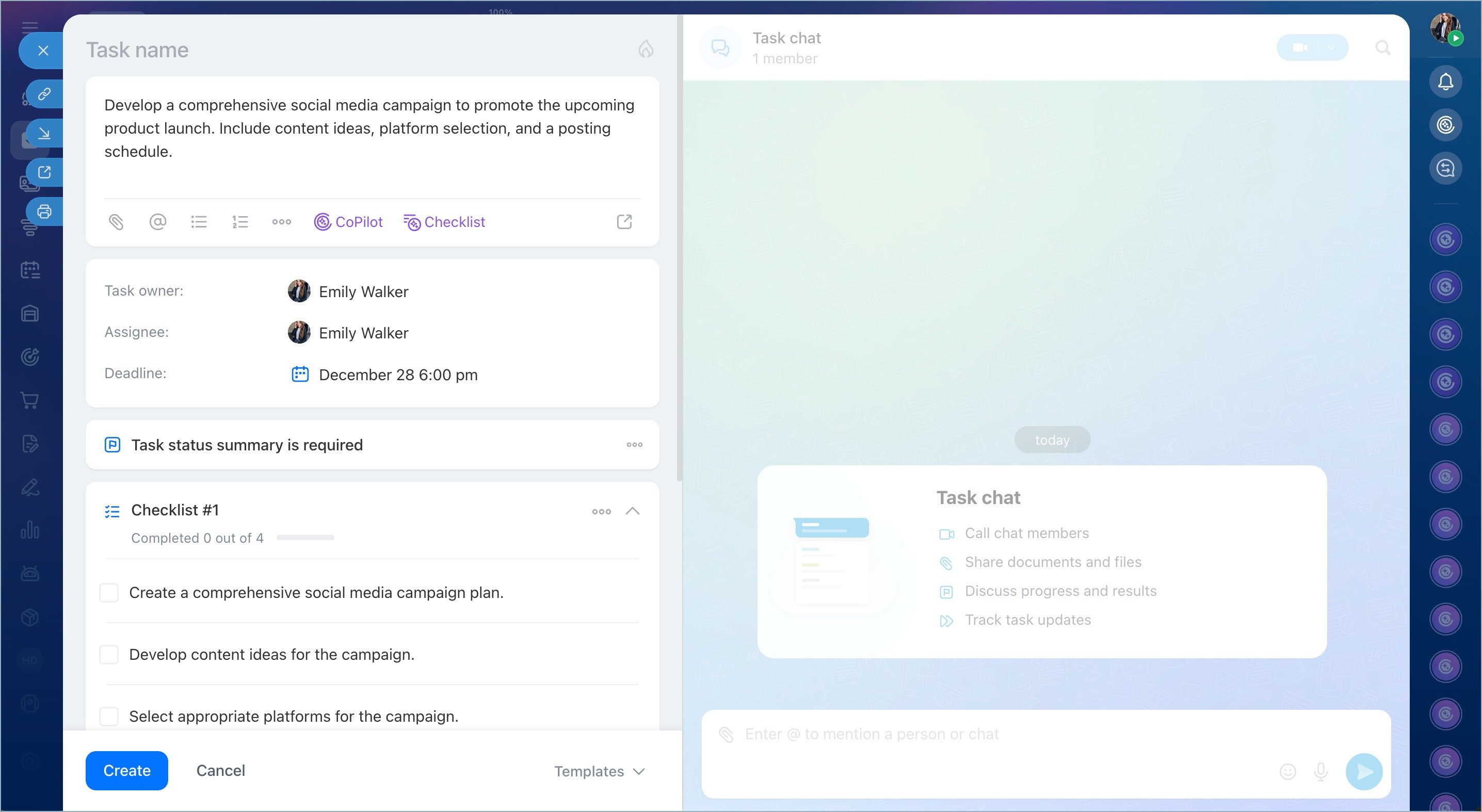 Let's say I need to create 5 tasks, each one with a separate description and a checklist. Doing it manually would probably take me an hour; with CoPilot – about 10 minutes. CoPilot easily breaks complex tasks into logical steps – all I have to do is set the assignees.