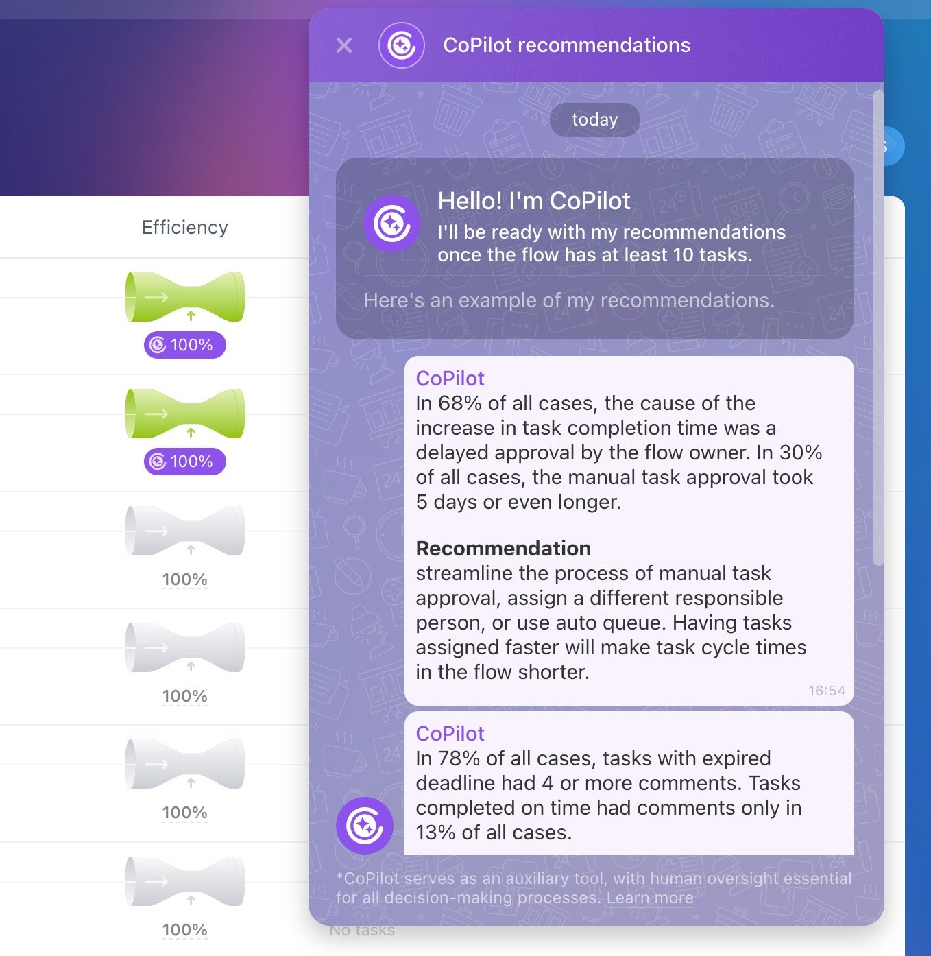 If you're using Flows in tasks, CoPilot will analyze a selected flow, identify weak spots and inefficiencies, and suggest improvements. If the team is performing well, CoPilot will highlight what helps them succeed.