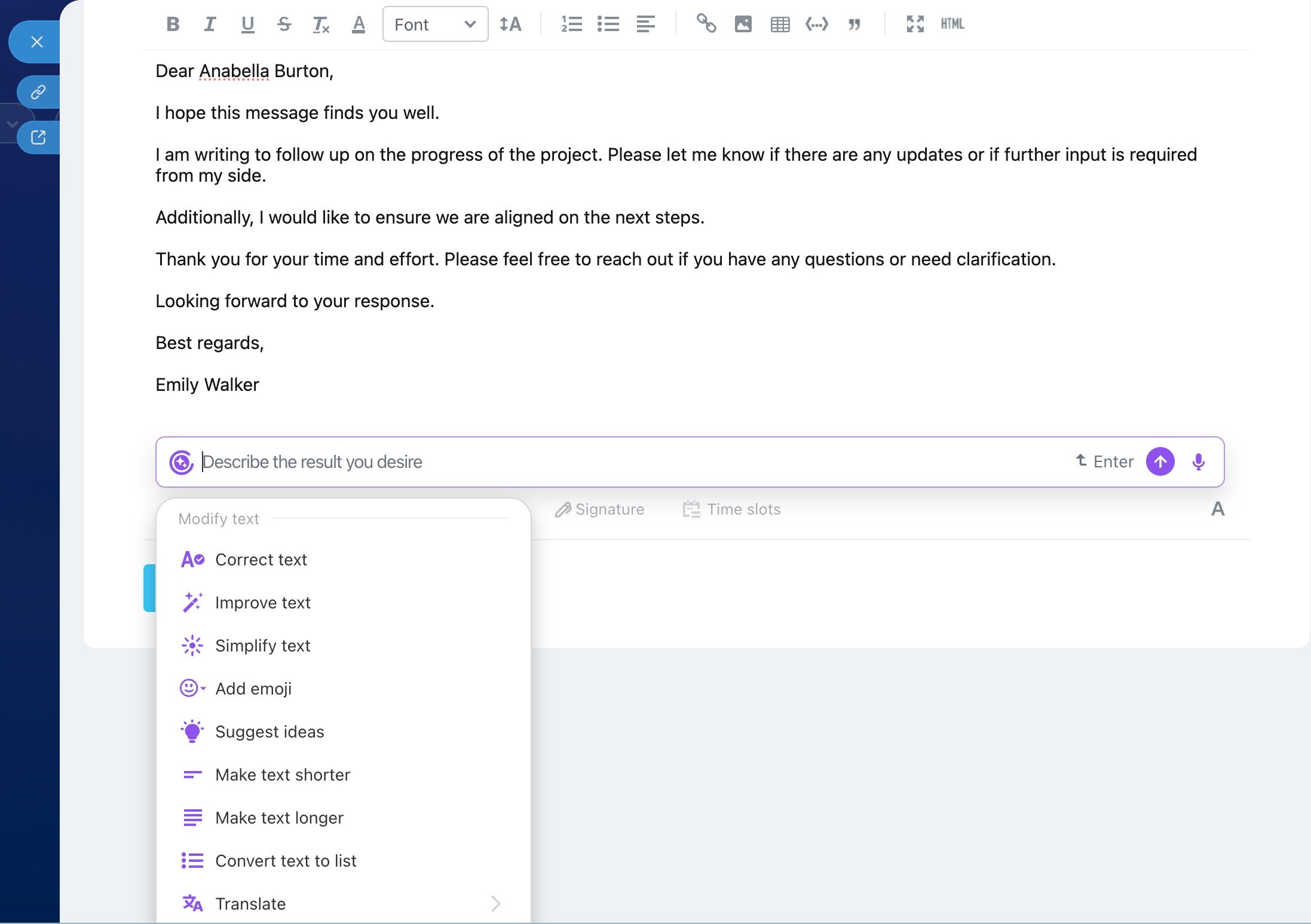 Here, you can use CoPilot to write and reply to client emails, shorten/expand existing texts, prepare offers, and more. These capabilities are available in the "Webmail" section of the main menu and also in CRM.