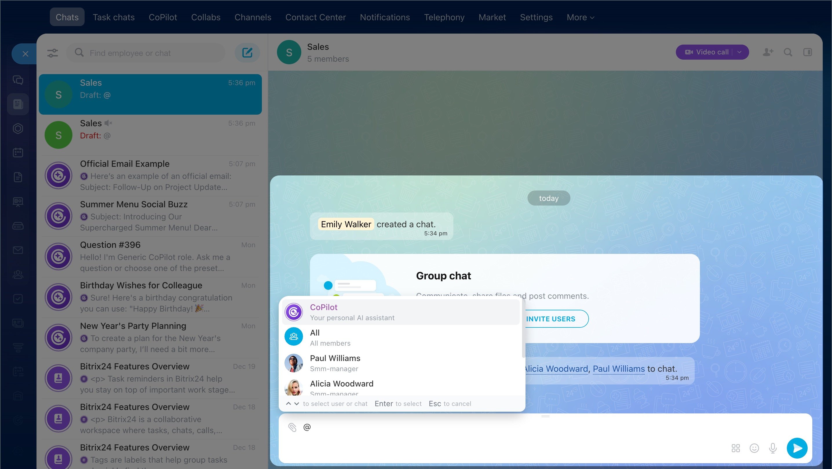Interact with CoPilot right inside your group or private chats in the Bitrix24 Messenger. This is especially helpful when you need to catch up after vacation or sick leave, summarize a long discussion, or onboard a new team member.