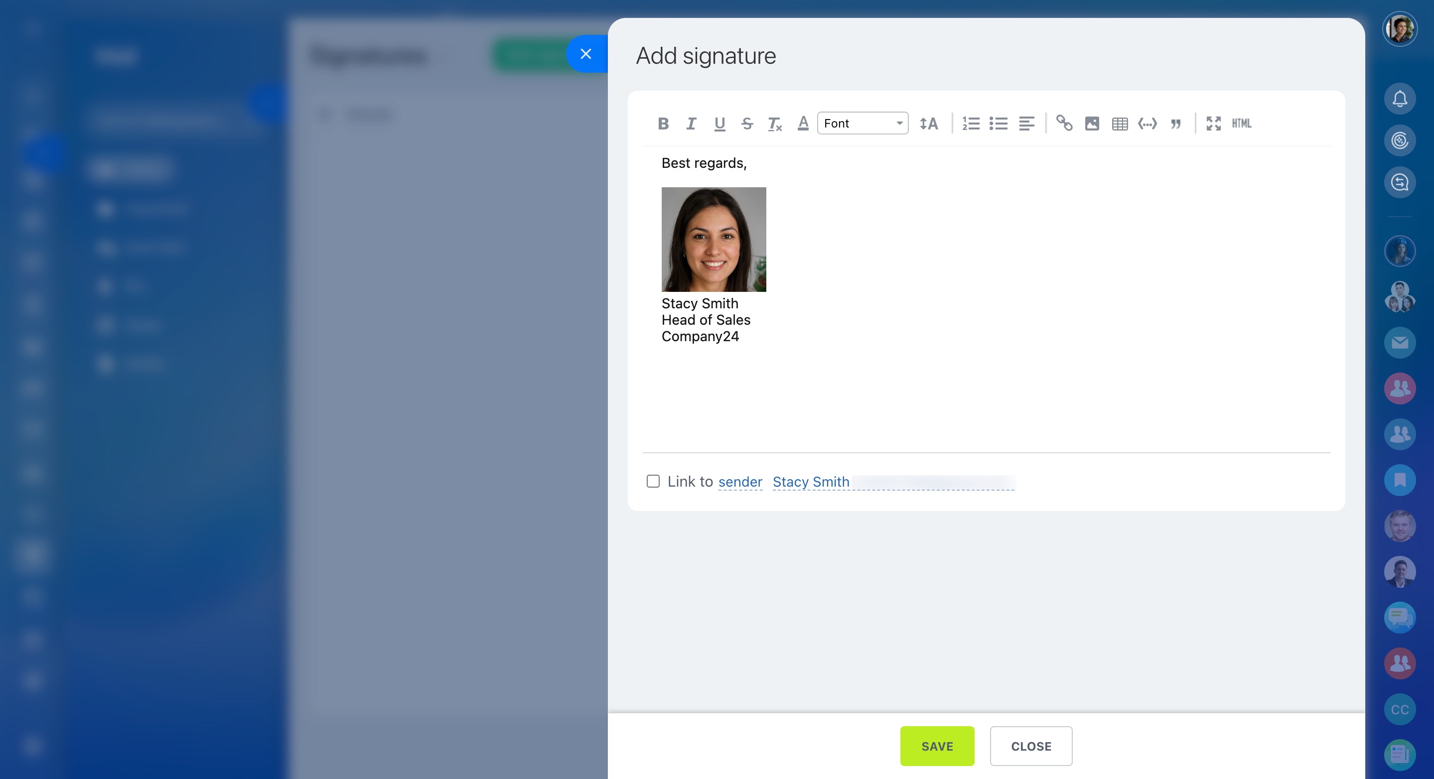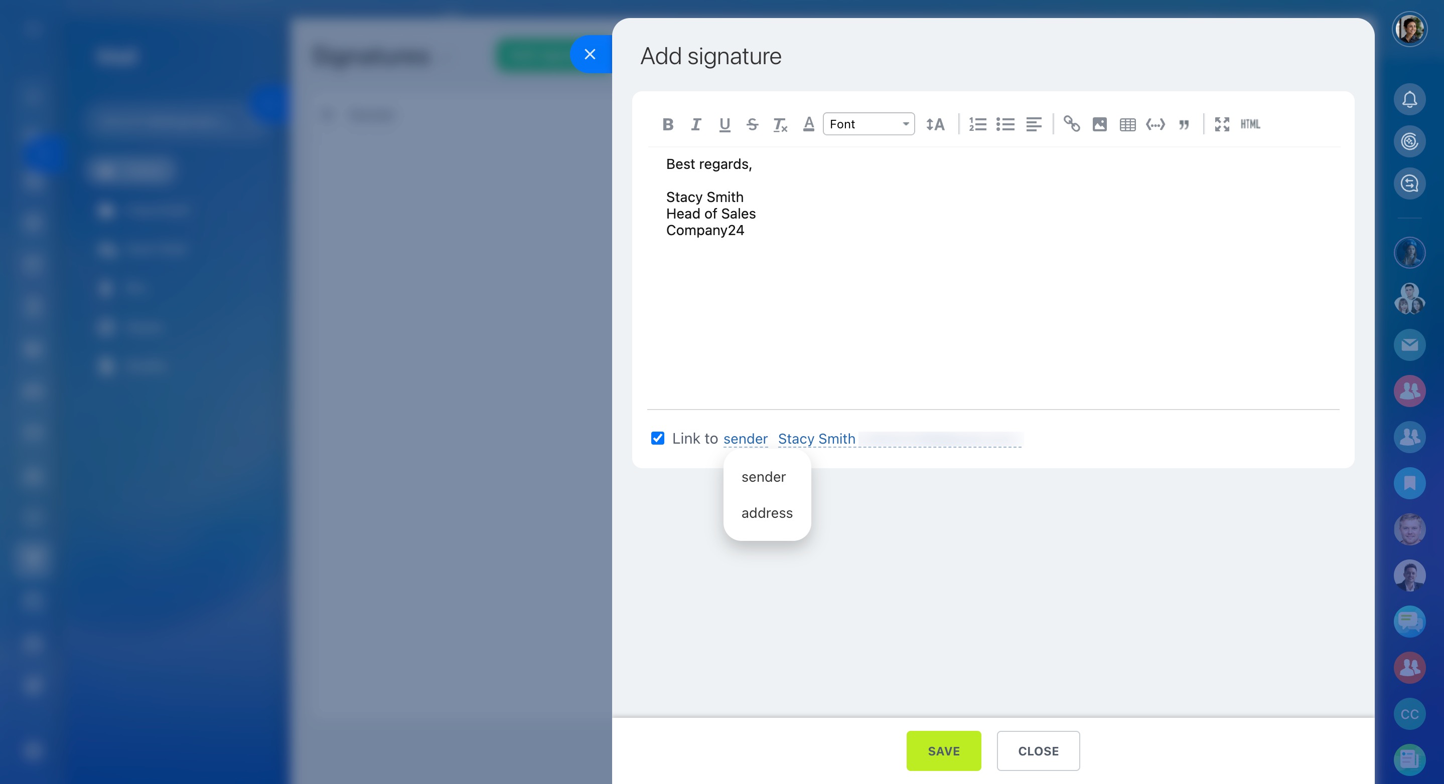 Link your signature to the sender or to a specific email address, if you have several ones.
