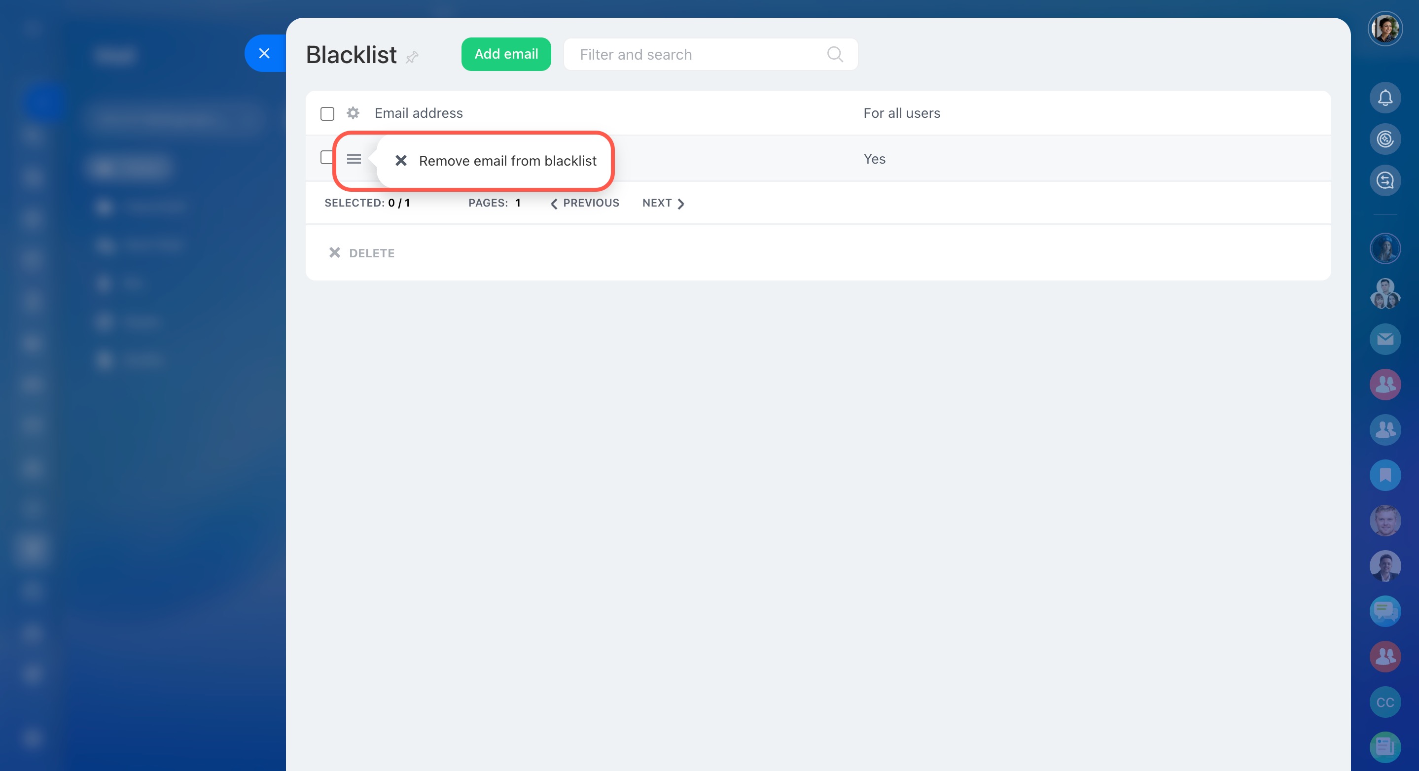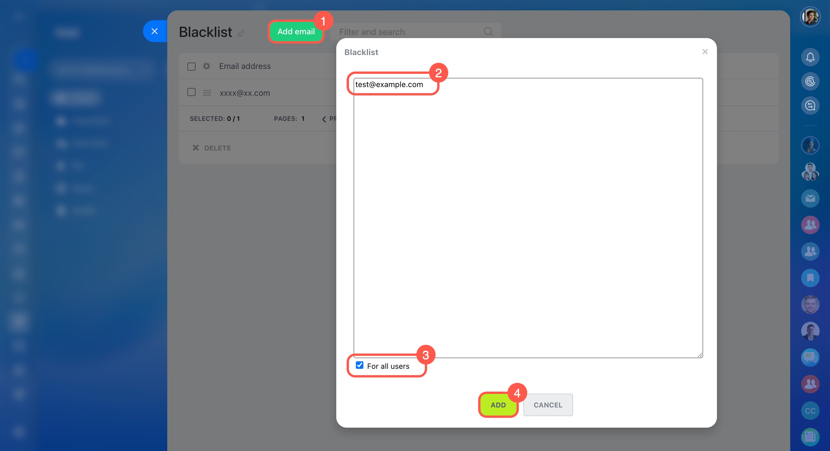 Under Blacklist, click Add email in the top-right corner and specify email addresses in the pop-up window.