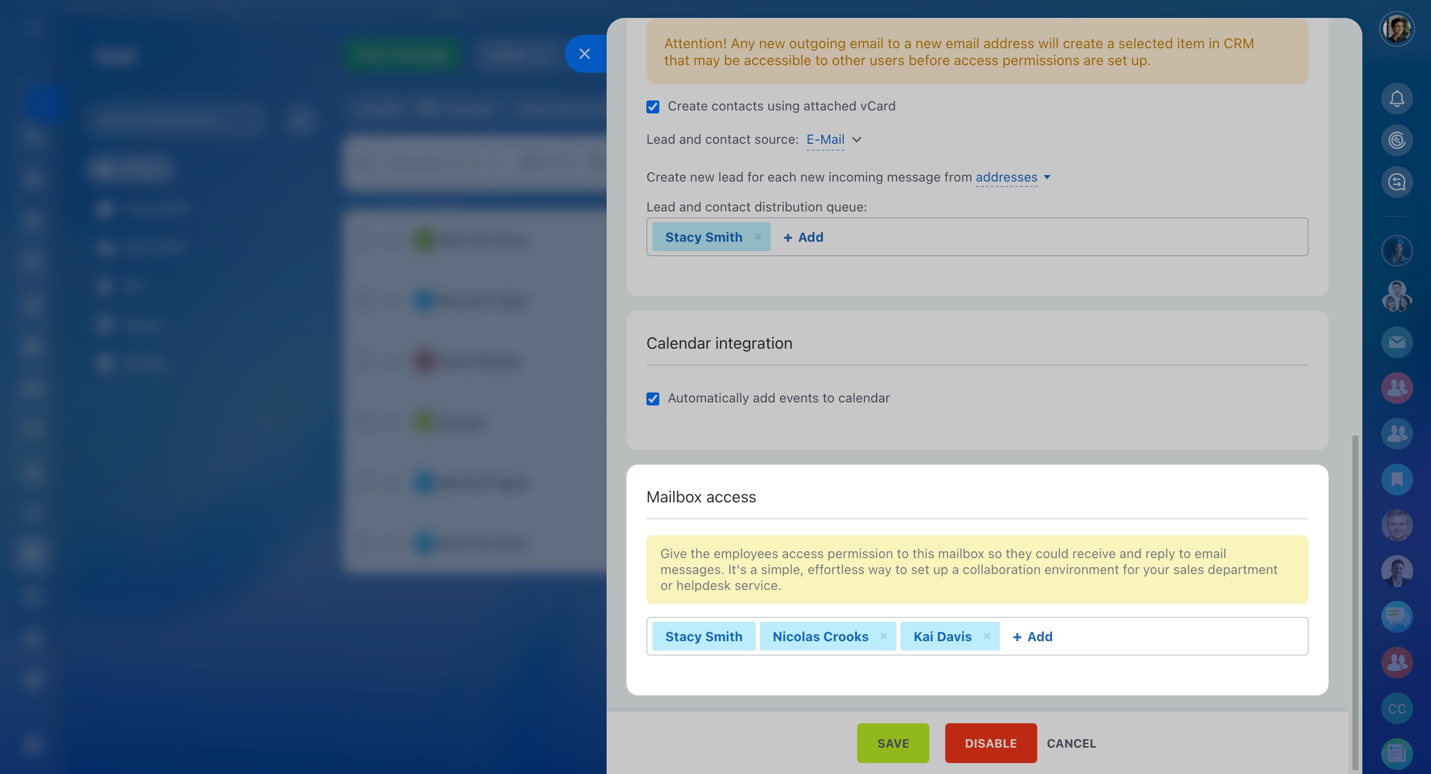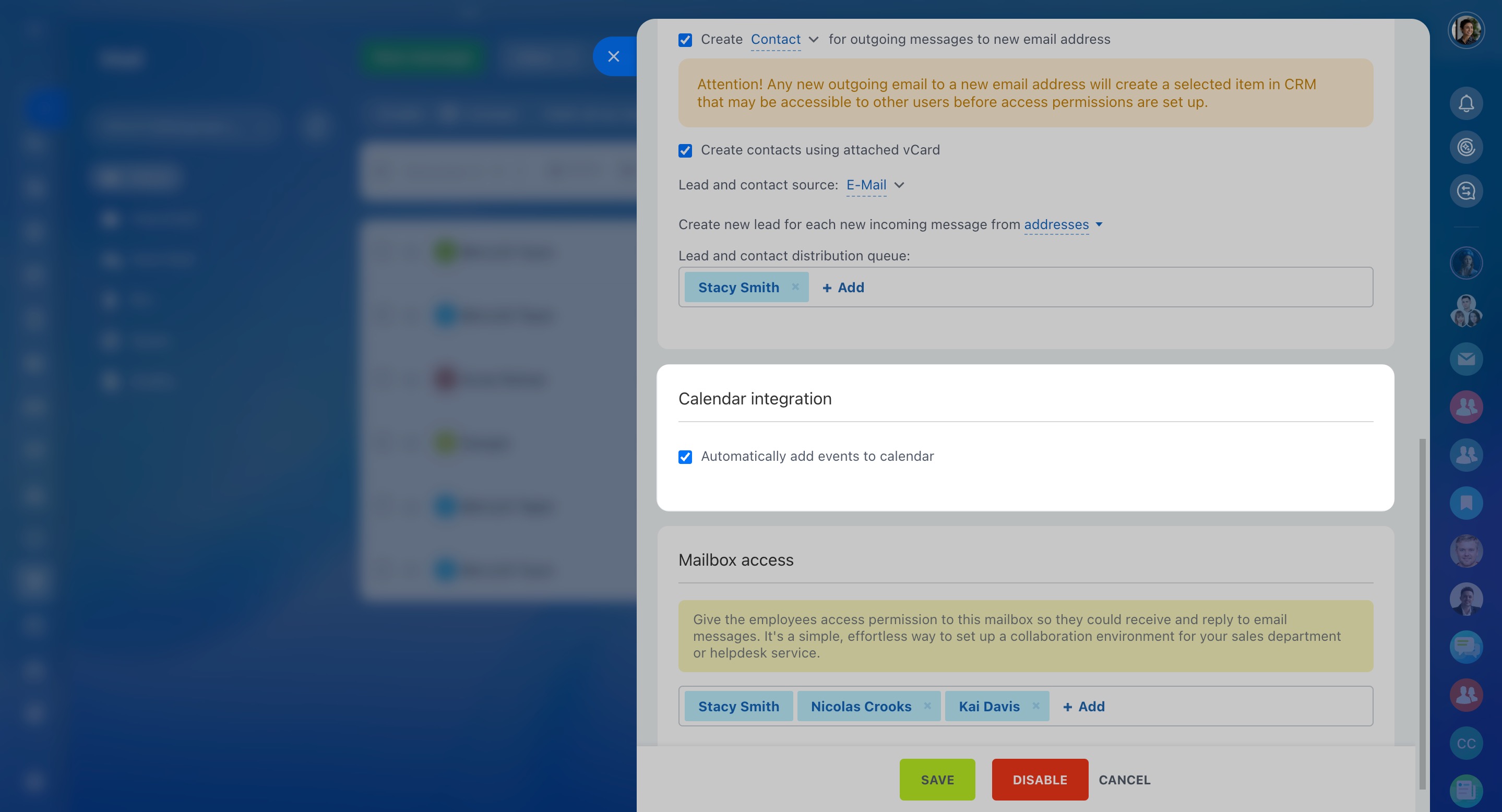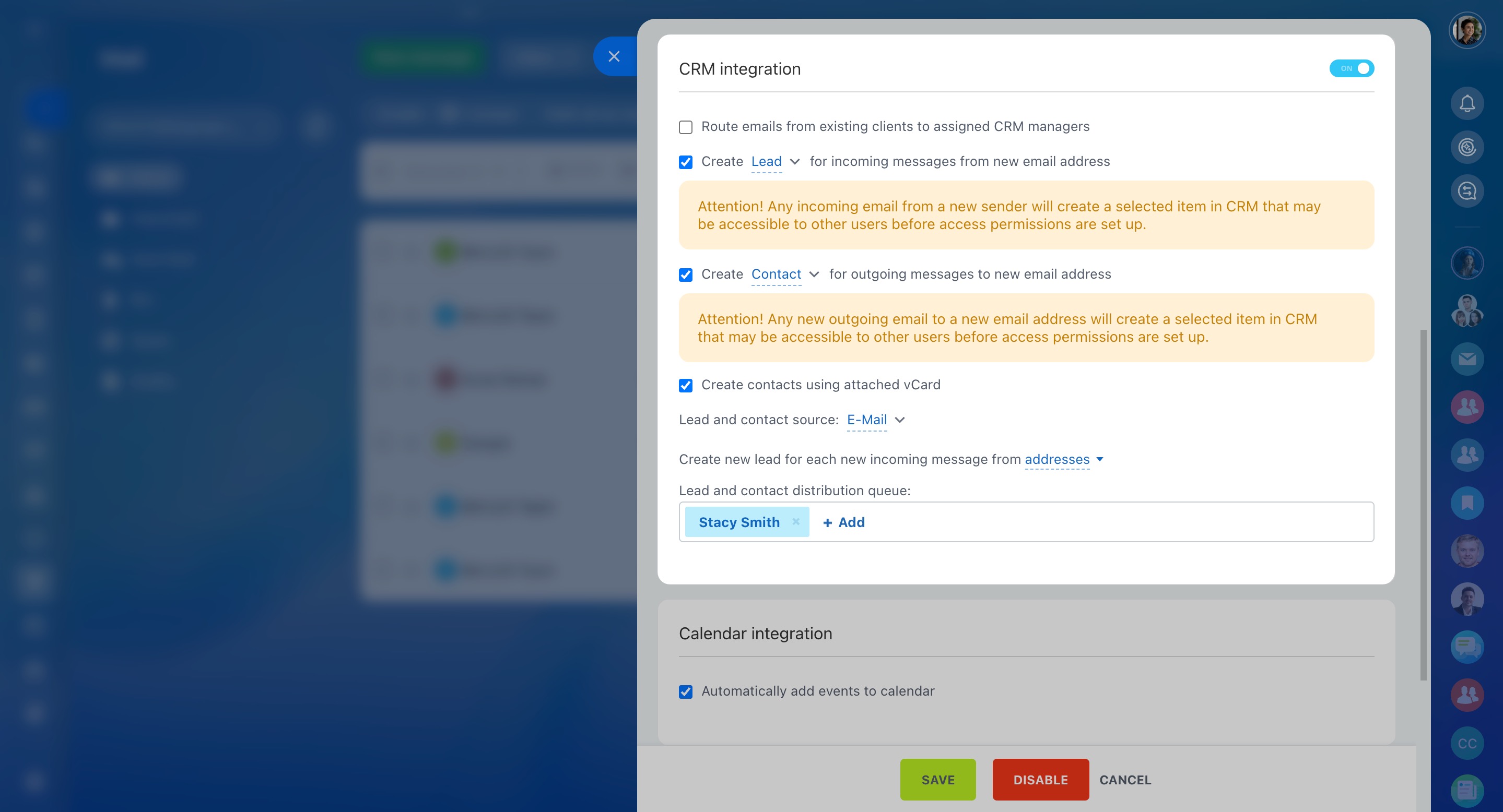 Activate the CRM integration option to save email messages to CRM. Decide which emails to integrate, for example, you can choose only the incoming ones. Put a tick next to the needed options to enable them. Also, configure the way the leads and contacts are distributed.