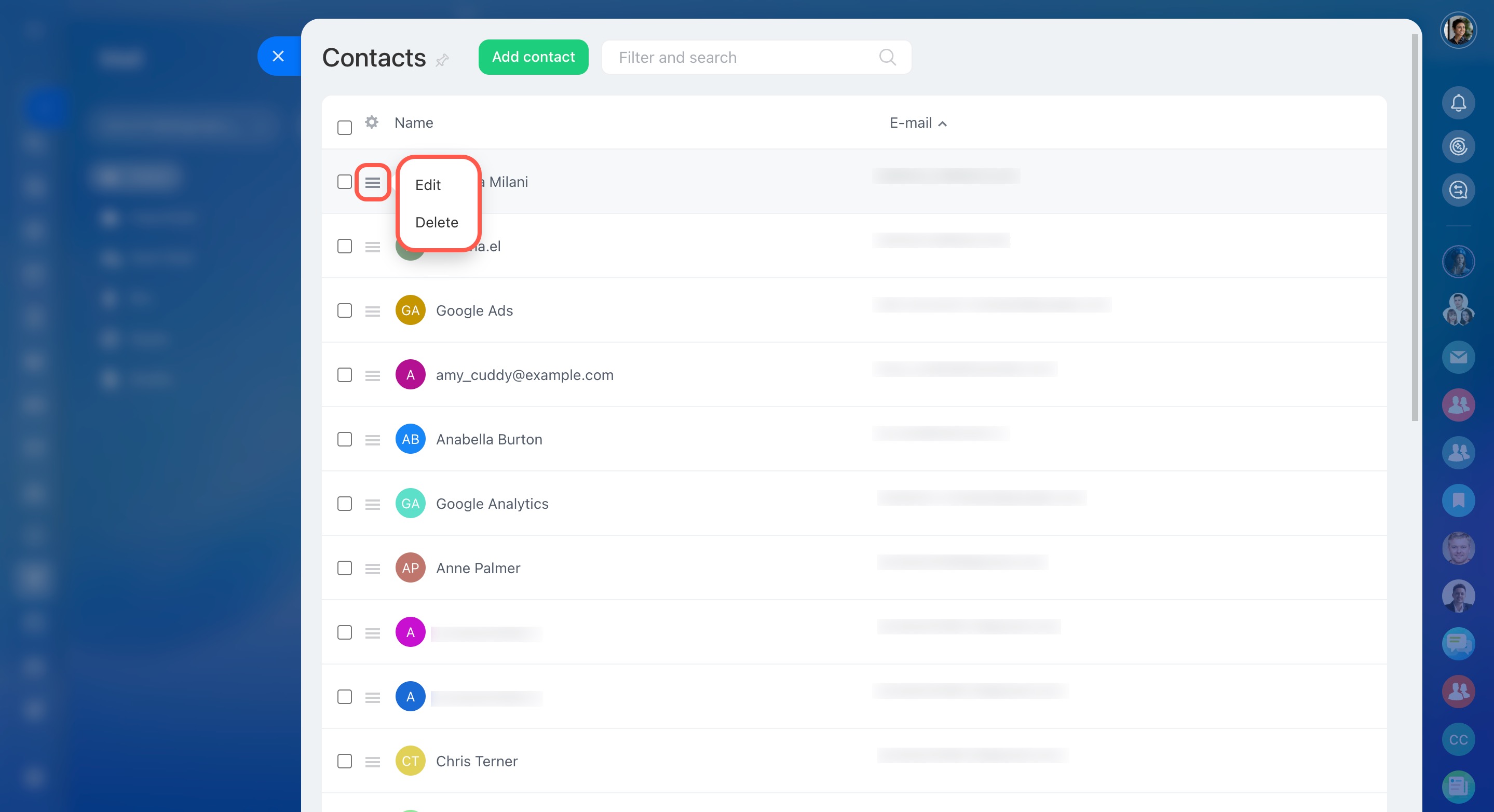 Under Contacts, you can find a list of all email addresses sent to you. To edit or delete a contact, use the actions menu.