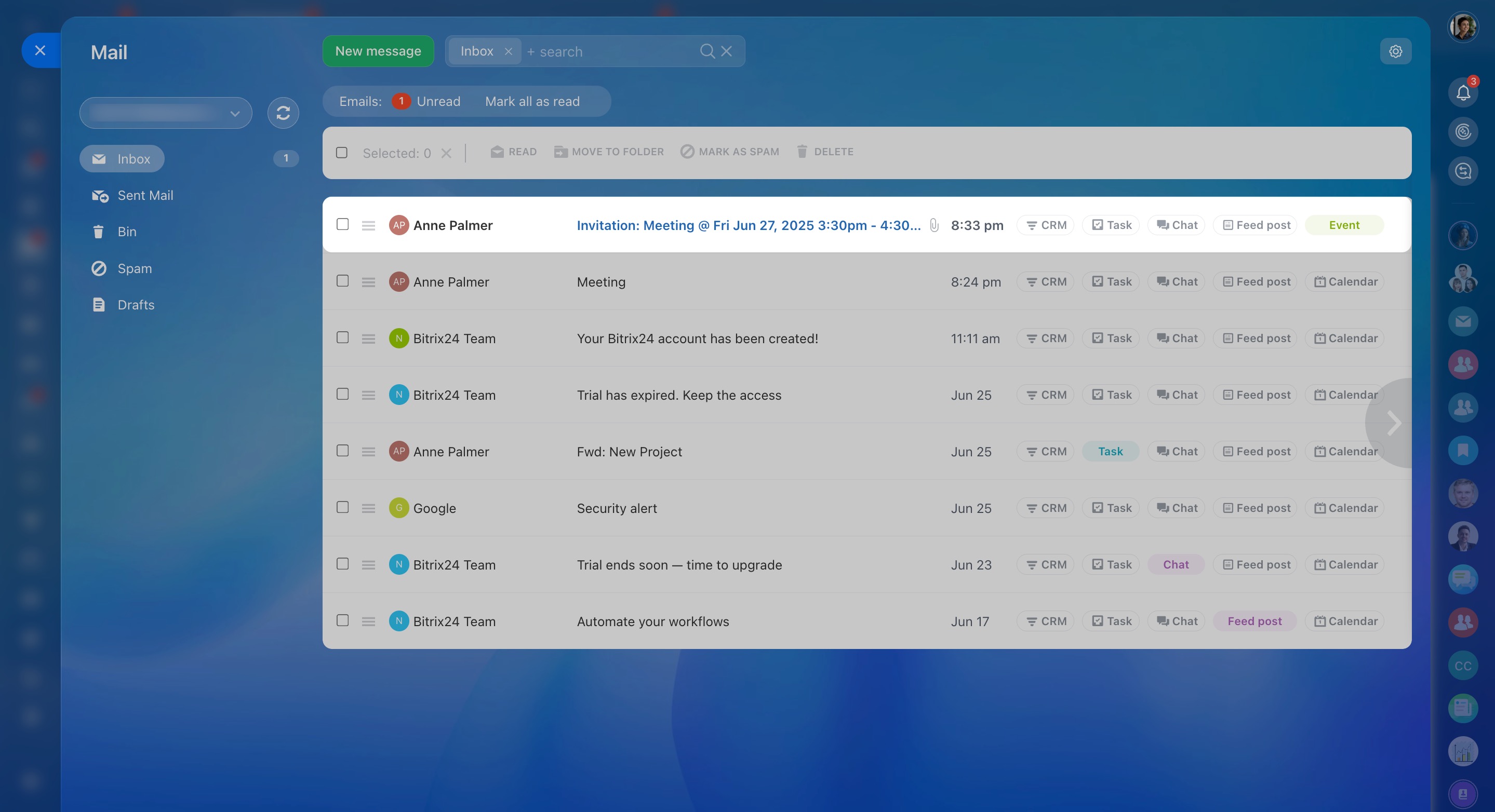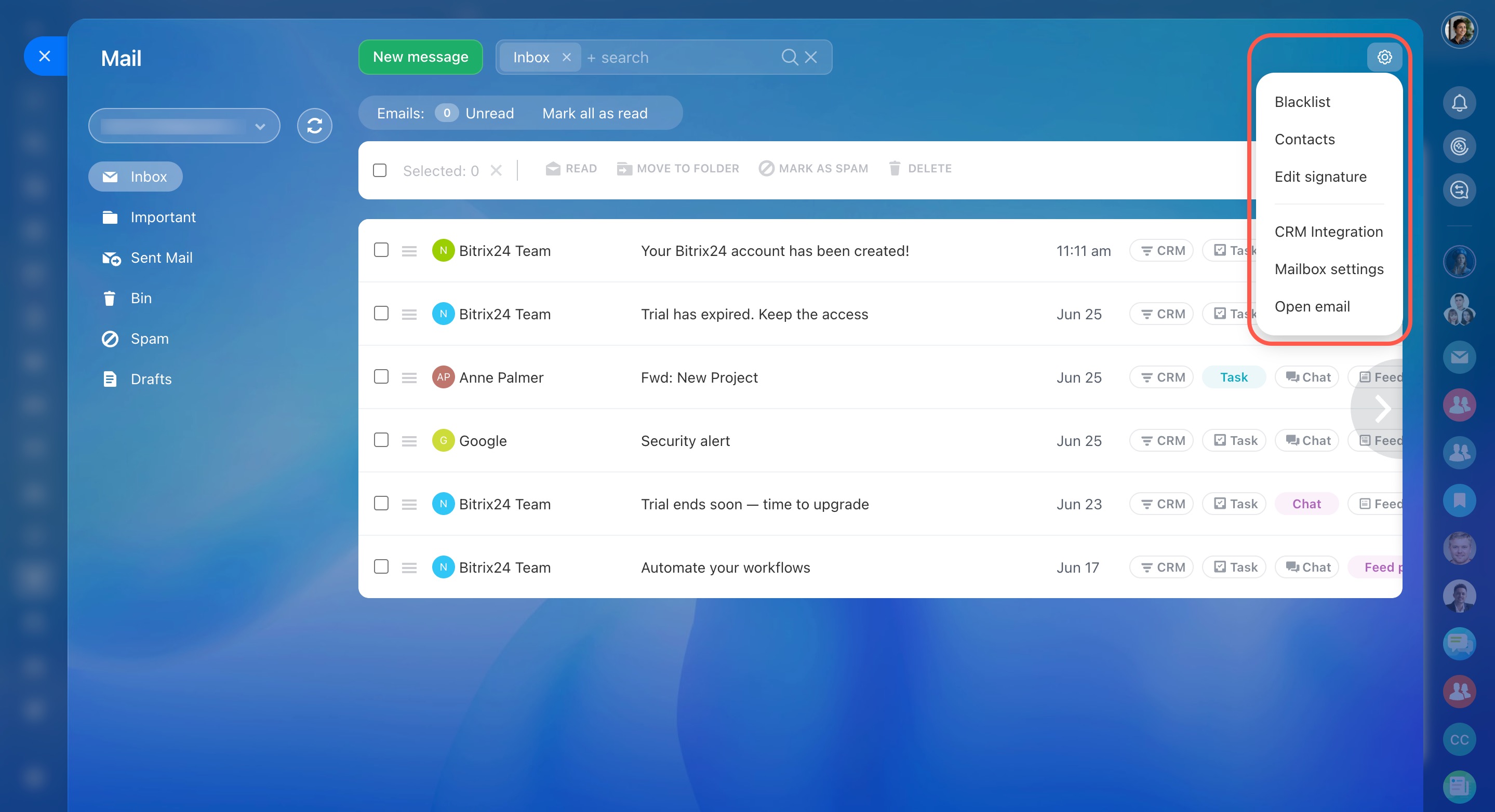 In Bitrix24 Mail, you can configure blacklist, contacts, signatures, and CRM and calendar integrations.