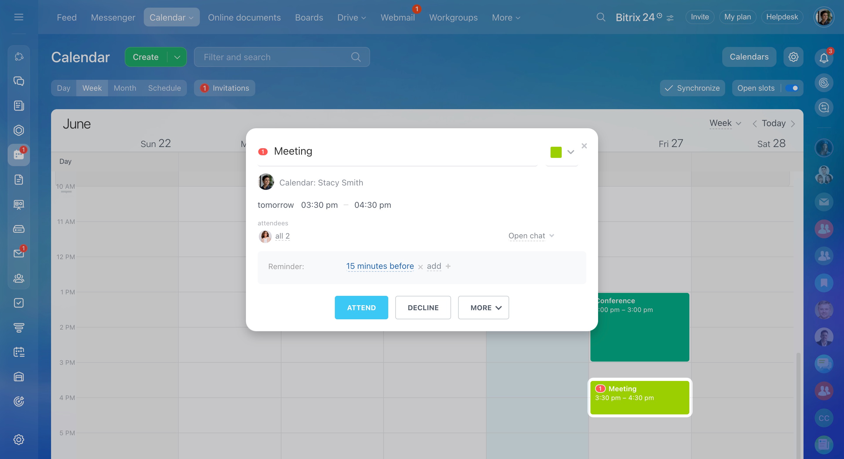 For example, when you get an email invitation for a meeting on Google Meet or another service, Bitrix24 will create an event in the calendar. You can then choose to accept or decline the invitation.
