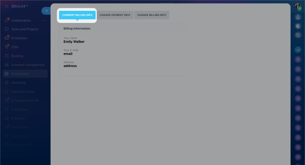 To update your payment or billing details, go to the Subscription section > Payment details > Billing Info.