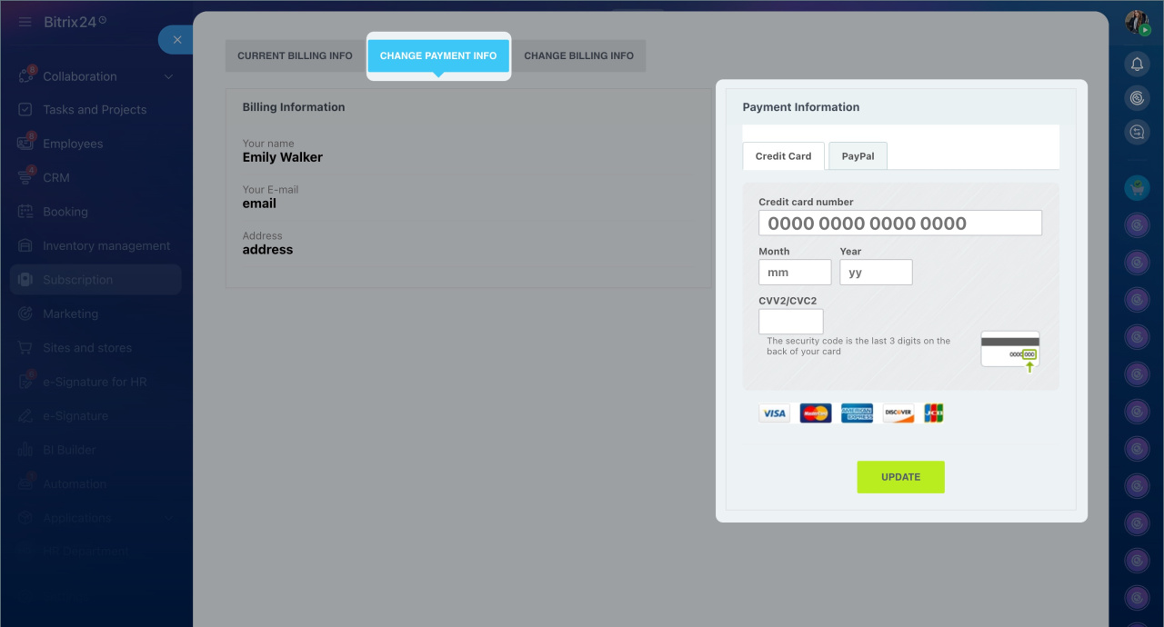 To update your payment information (credit card or PayPal), switch to the Change payment info tab. Enter new details and click Update.