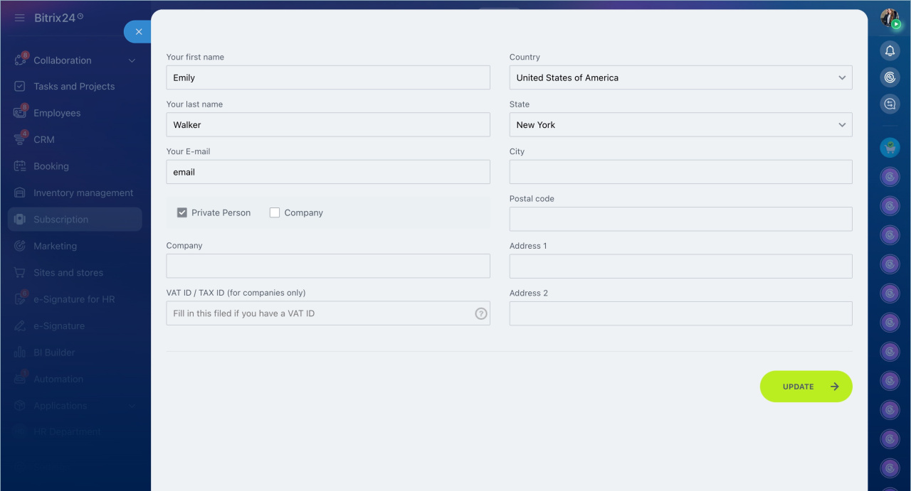 To update your billing information, switch to the Change billing info tab. Complete the form and click Update.