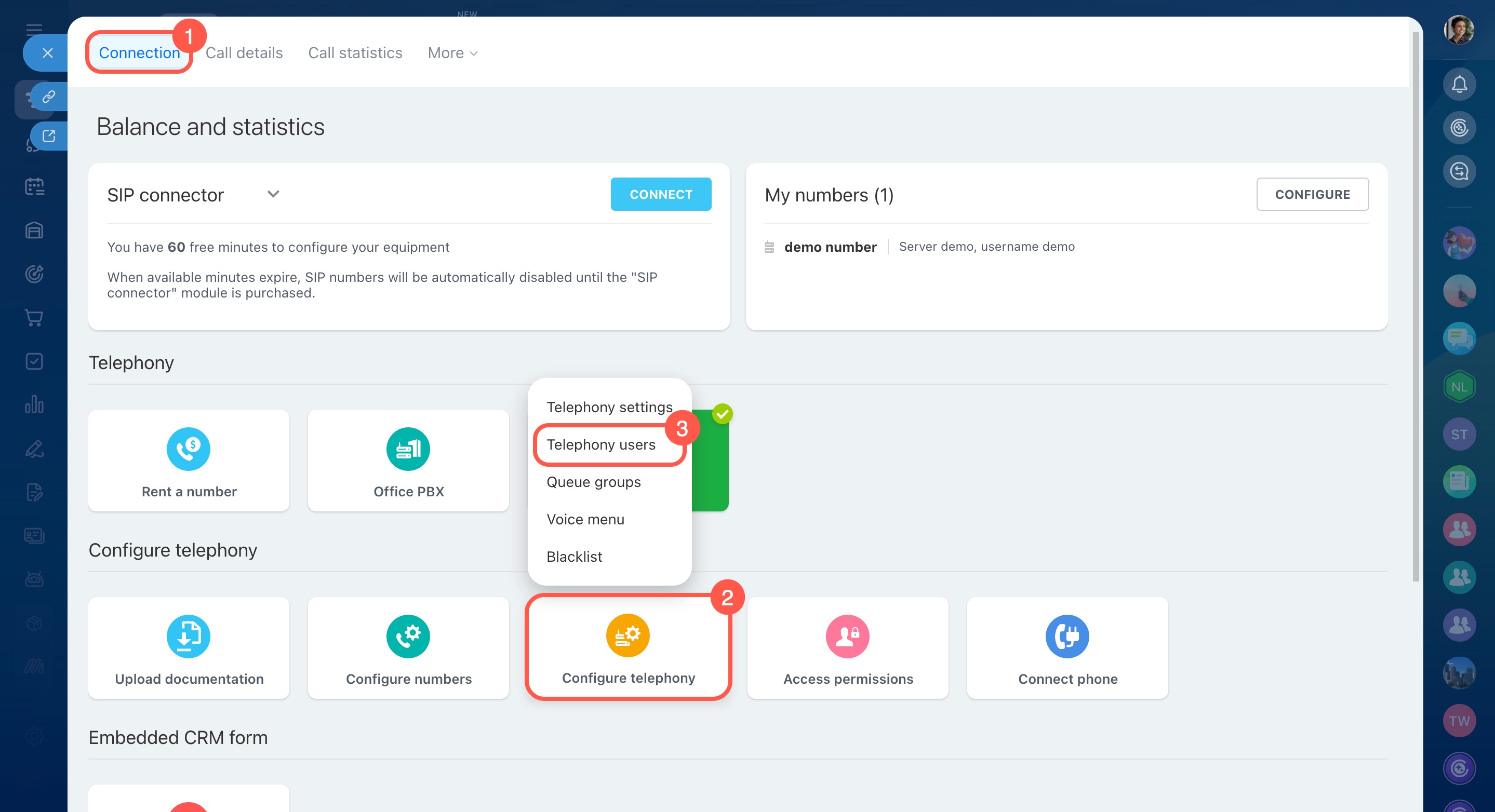 In Bitrix24 Telephony, you can configure extension numbers, connect SIP phones, and choose a number for outbound calls. In this article, we explain how to enable these options for your call-handling employees.