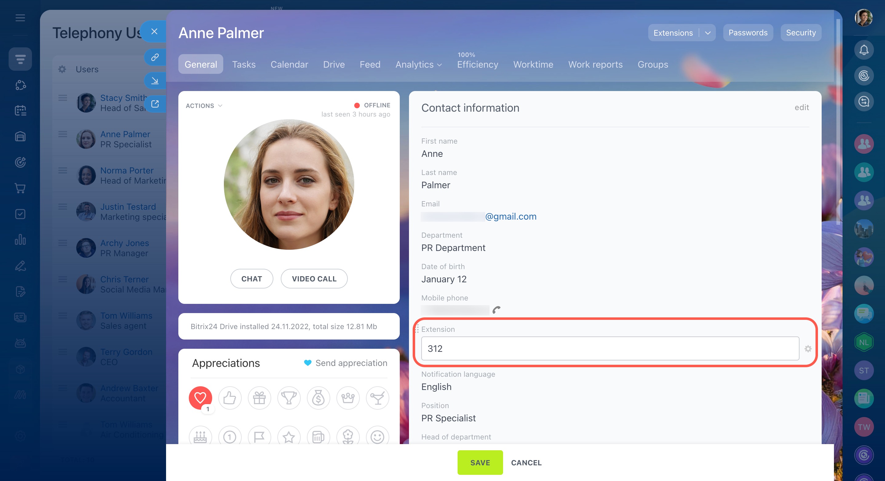 - Or you can specify the employee's extension number by editing the Extension field in his or her profile.