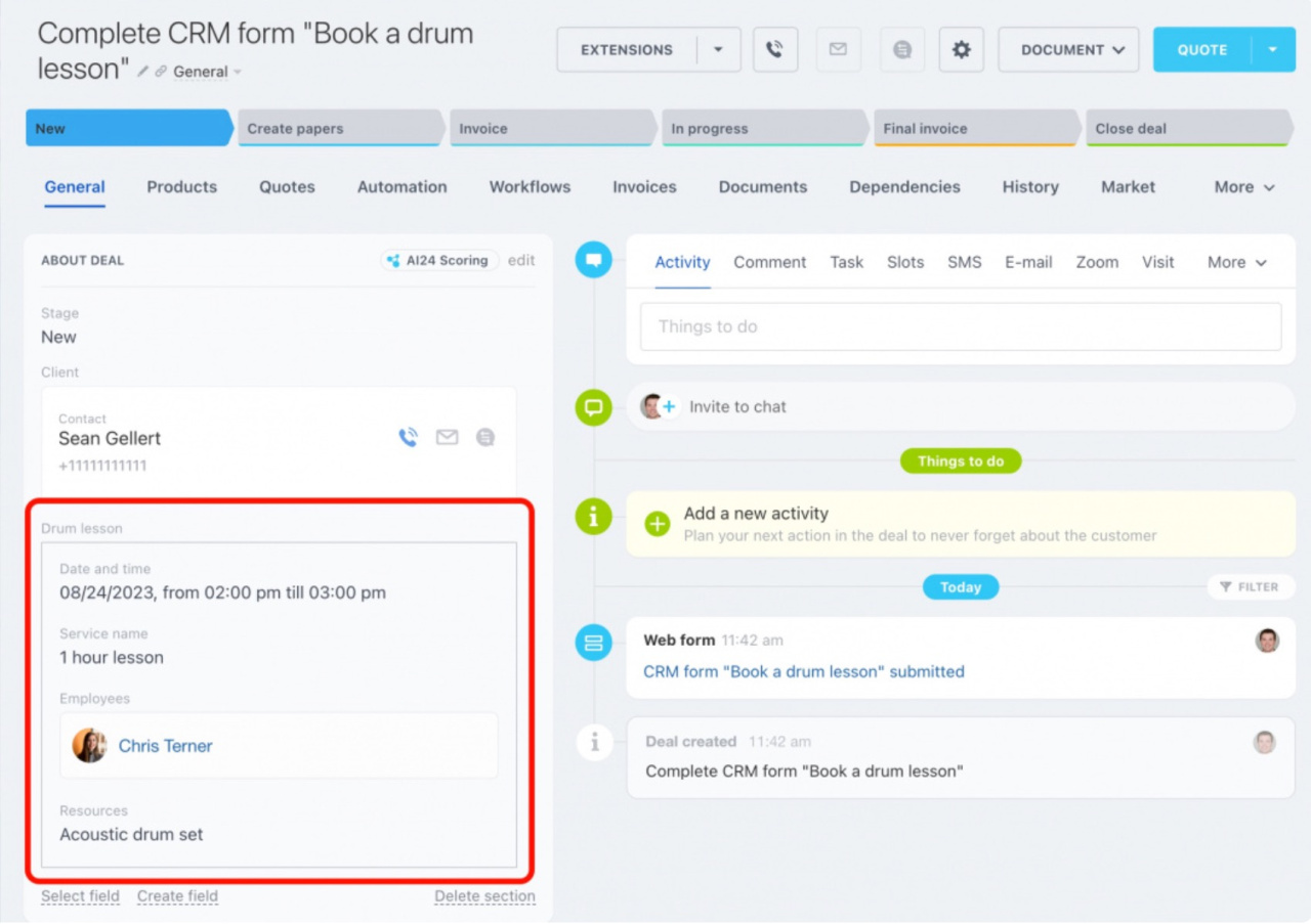 Once the client has filled out the form, a lead or a deal (depending on the form settings) is created in CRM. It records the client's contact information and all the information about the booking. You can contact the client later to confirm an appointment.