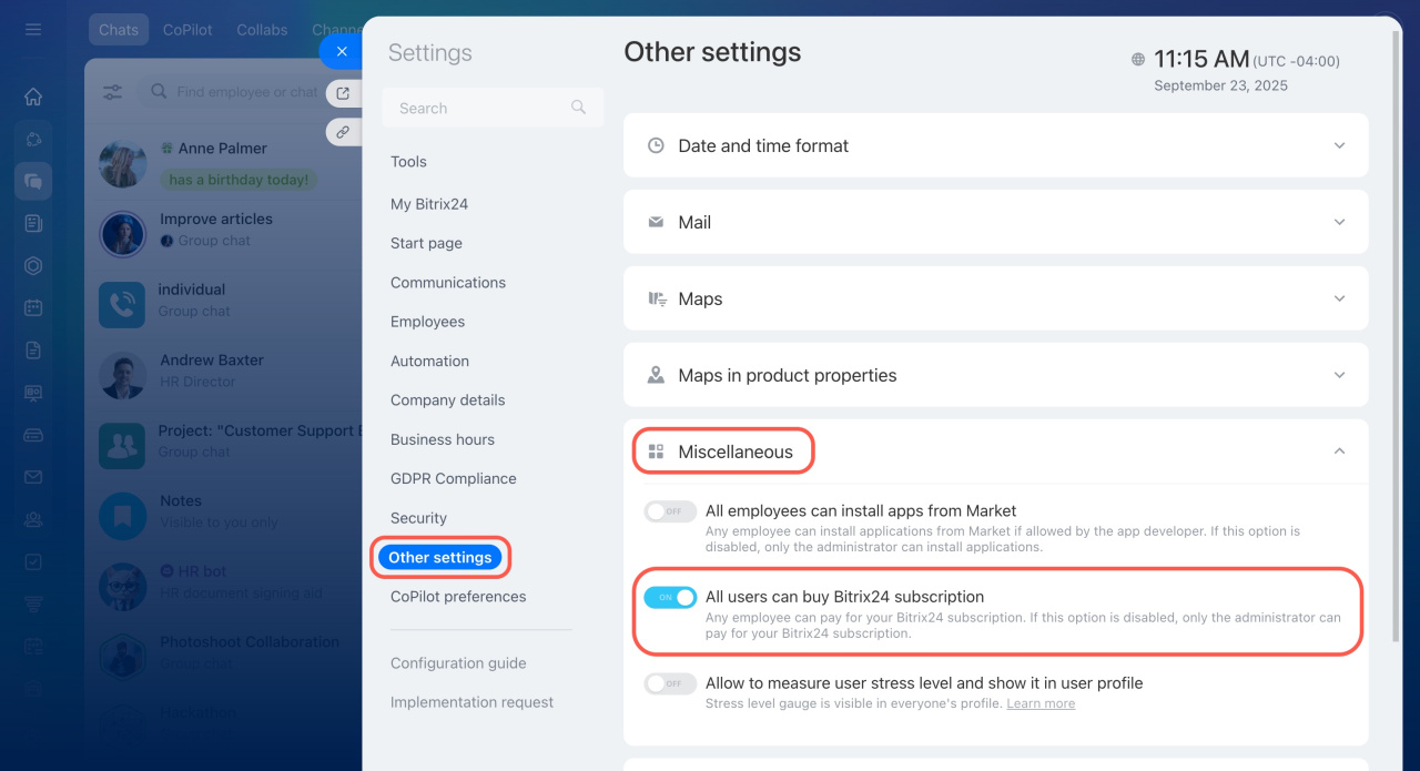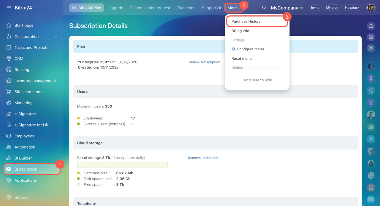 By default, the Purchase History page is available only to account administrators. Other users can access it if the All users can buy Bitrix24 subscription option is enabled in your account settings.