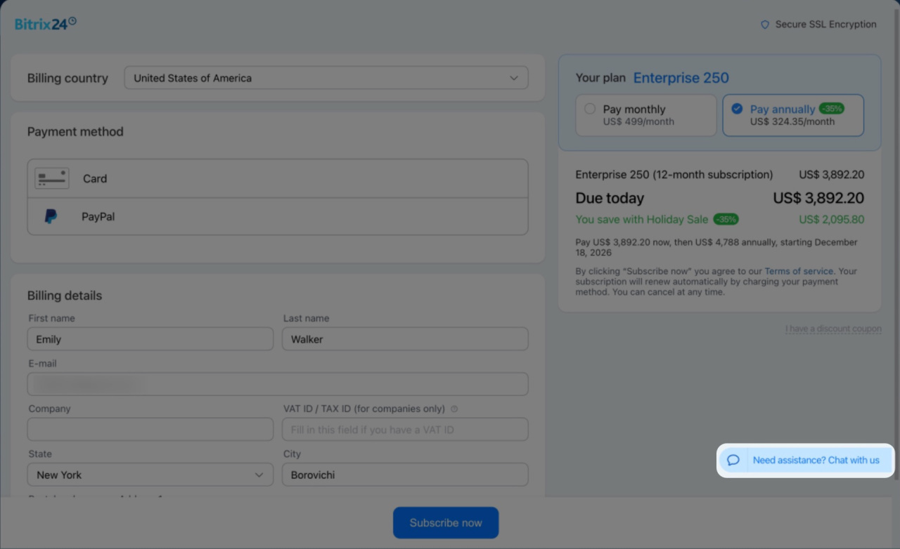 Choose your payment method and fill in its details. Make sure that the checkout reflects your desired subscription plan and billing period and that the total price is the same as you expect.