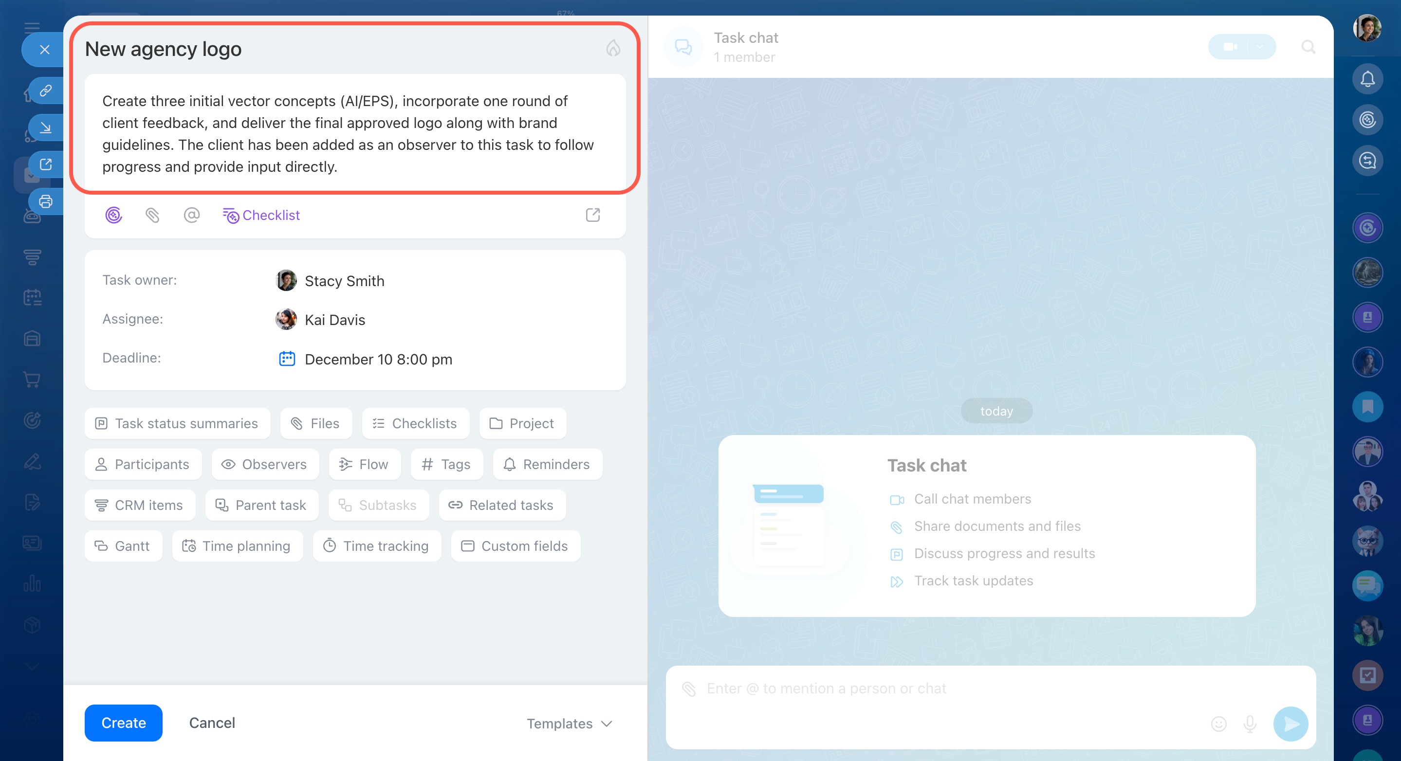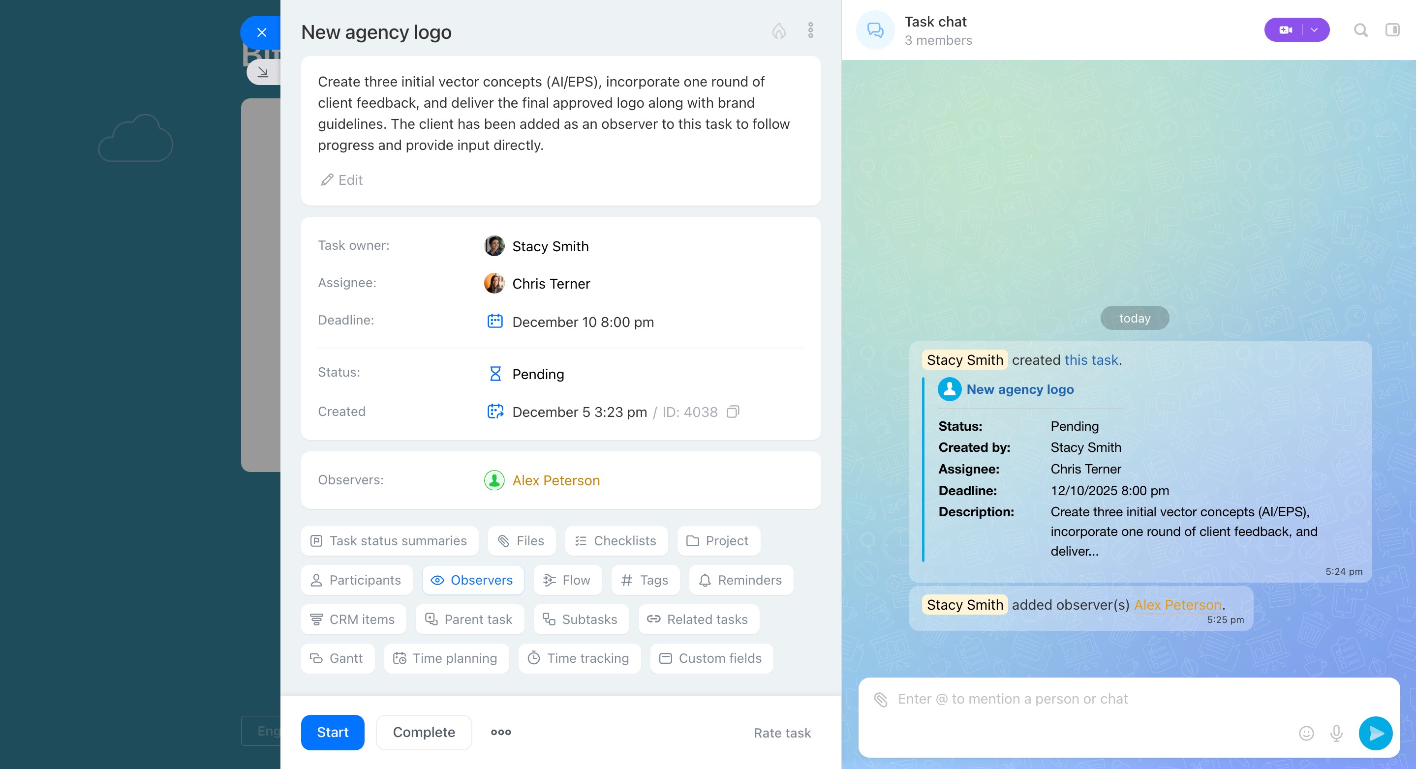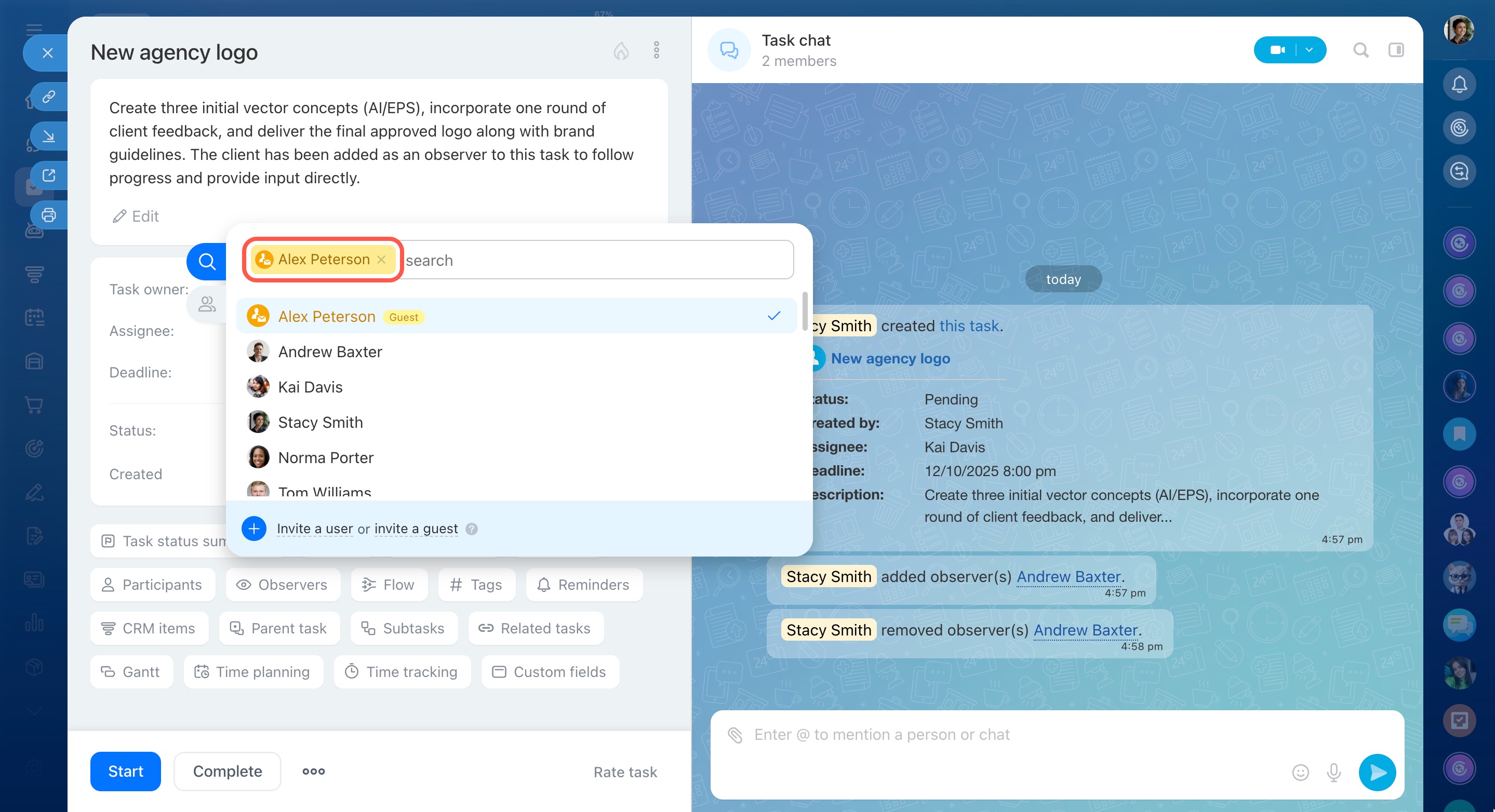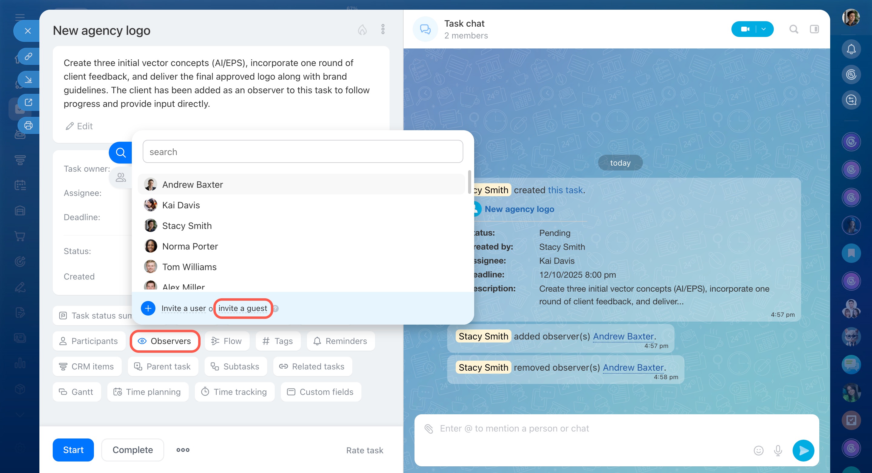 Sometimes you need to connect people outside your company to work with tasks: clients, partners or freelancers. These are external users who should be involved into the task. At the same time, you can deny access to other company information.