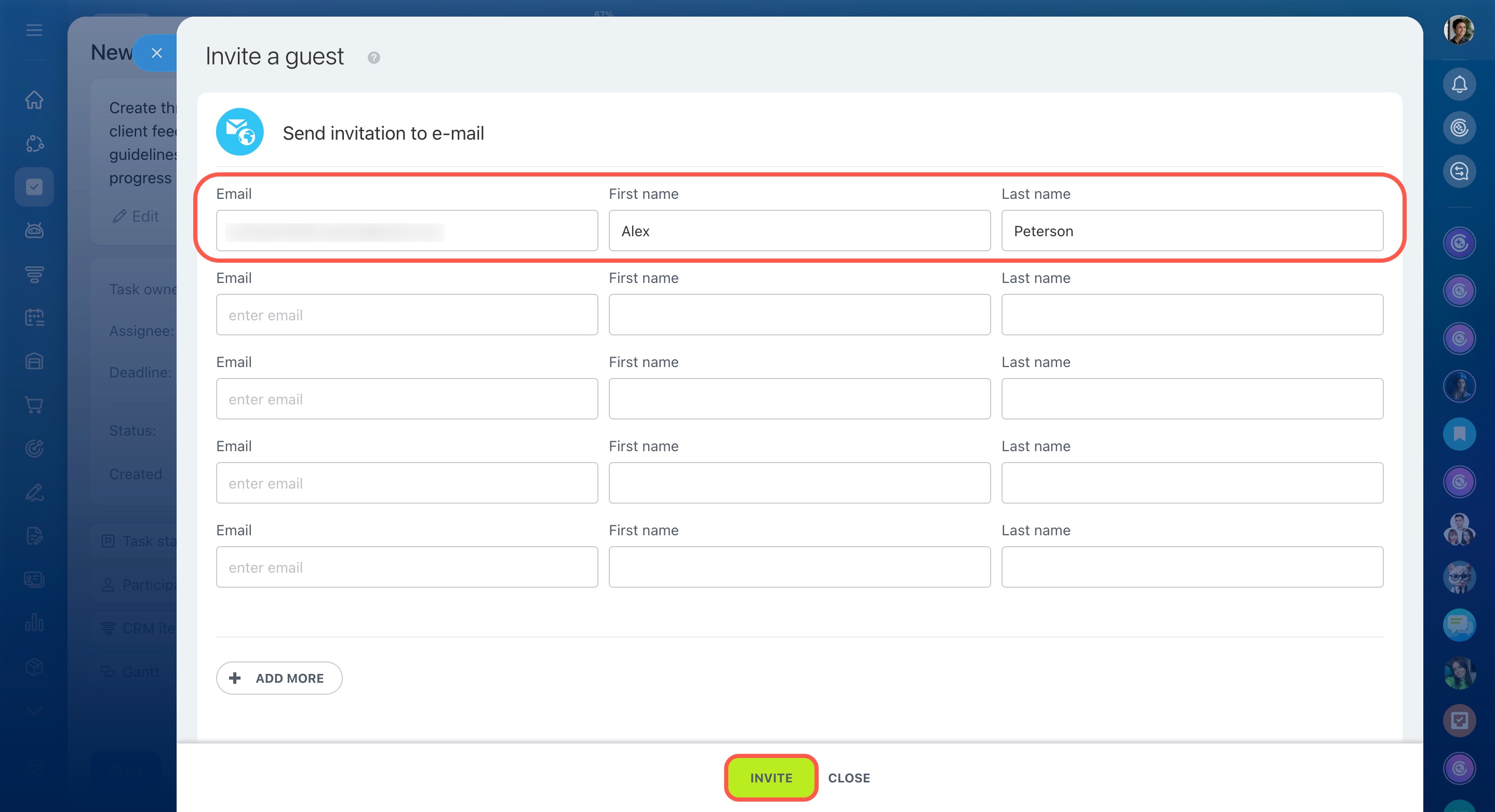 The external user can be responsible person, a participant or an observer. Define their role in the task, click Add - Invite Guest.