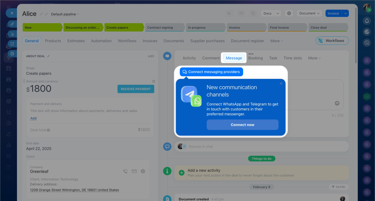 Edit the message text by clicking on the pencil icon. Then adjust the other parameters on this page and click Send at the bottom. Once the client opens a link and pays, you will see the information about it in the deal timeline.