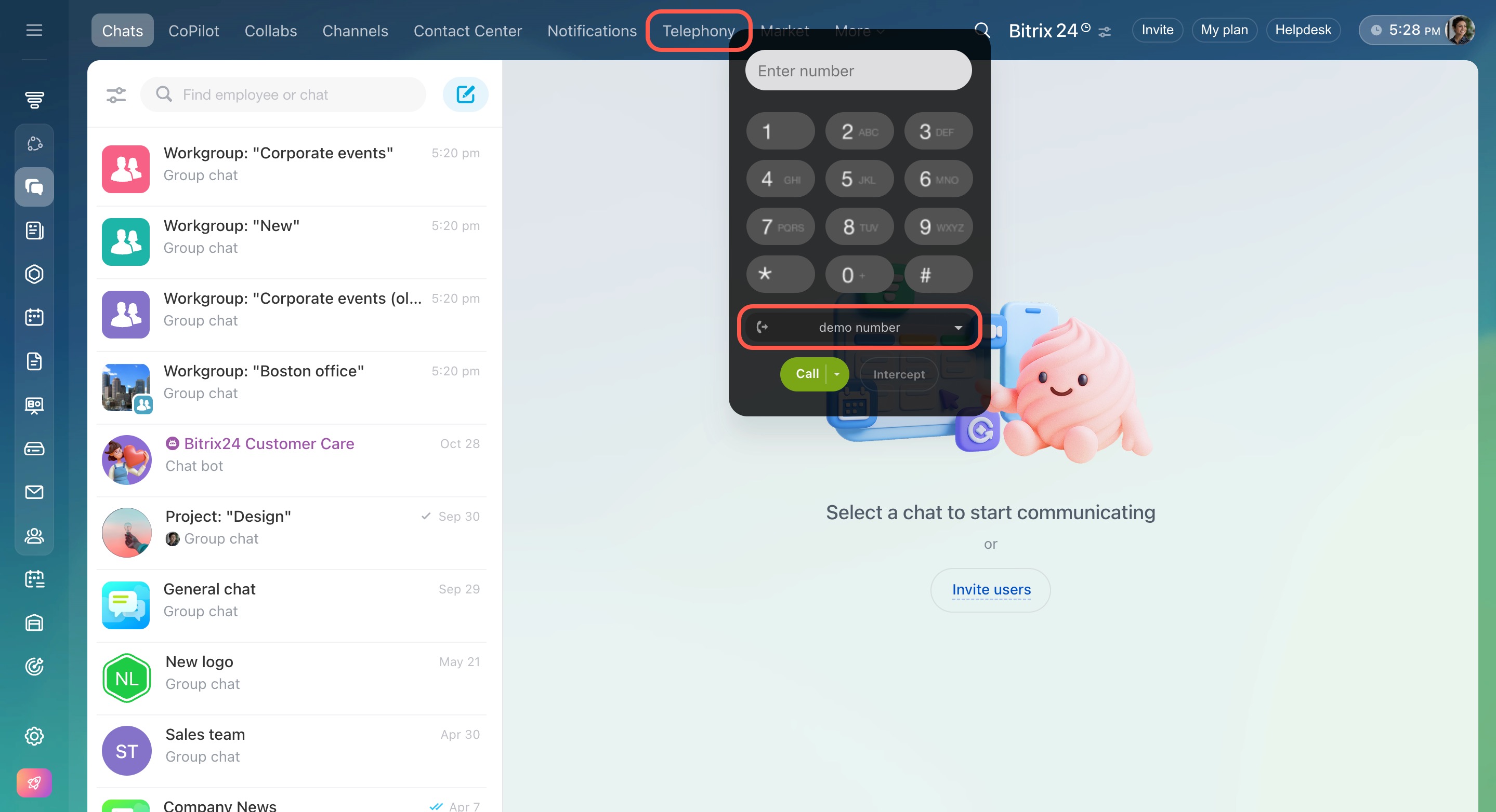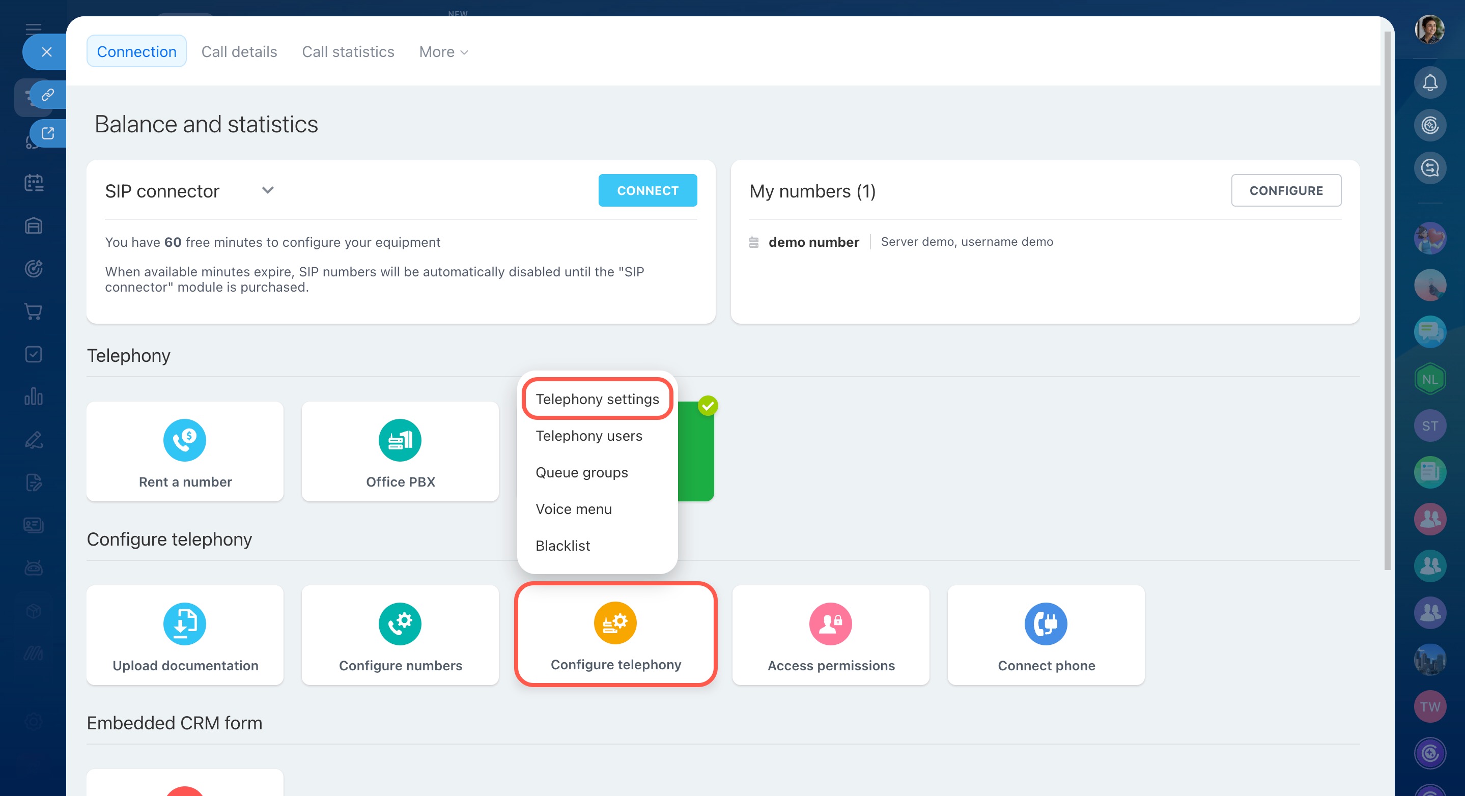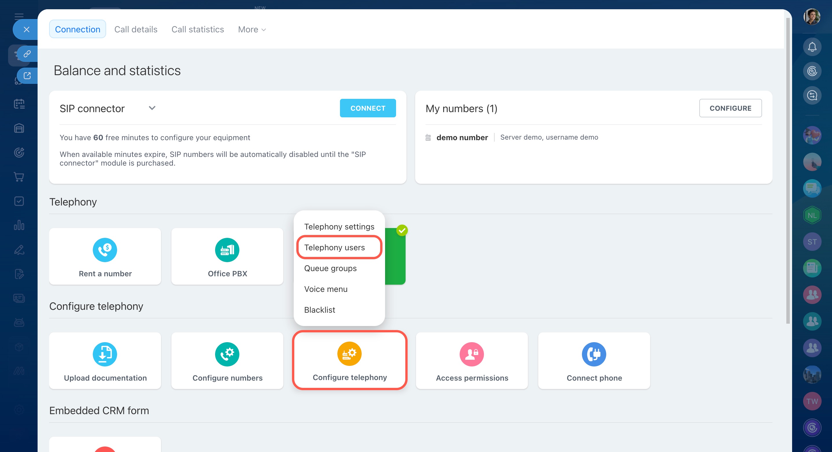 Bitrix24 Telephony supports both incoming and outgoing calls. If several numbers are connected, you can decide which one your employees will use to make calls.
