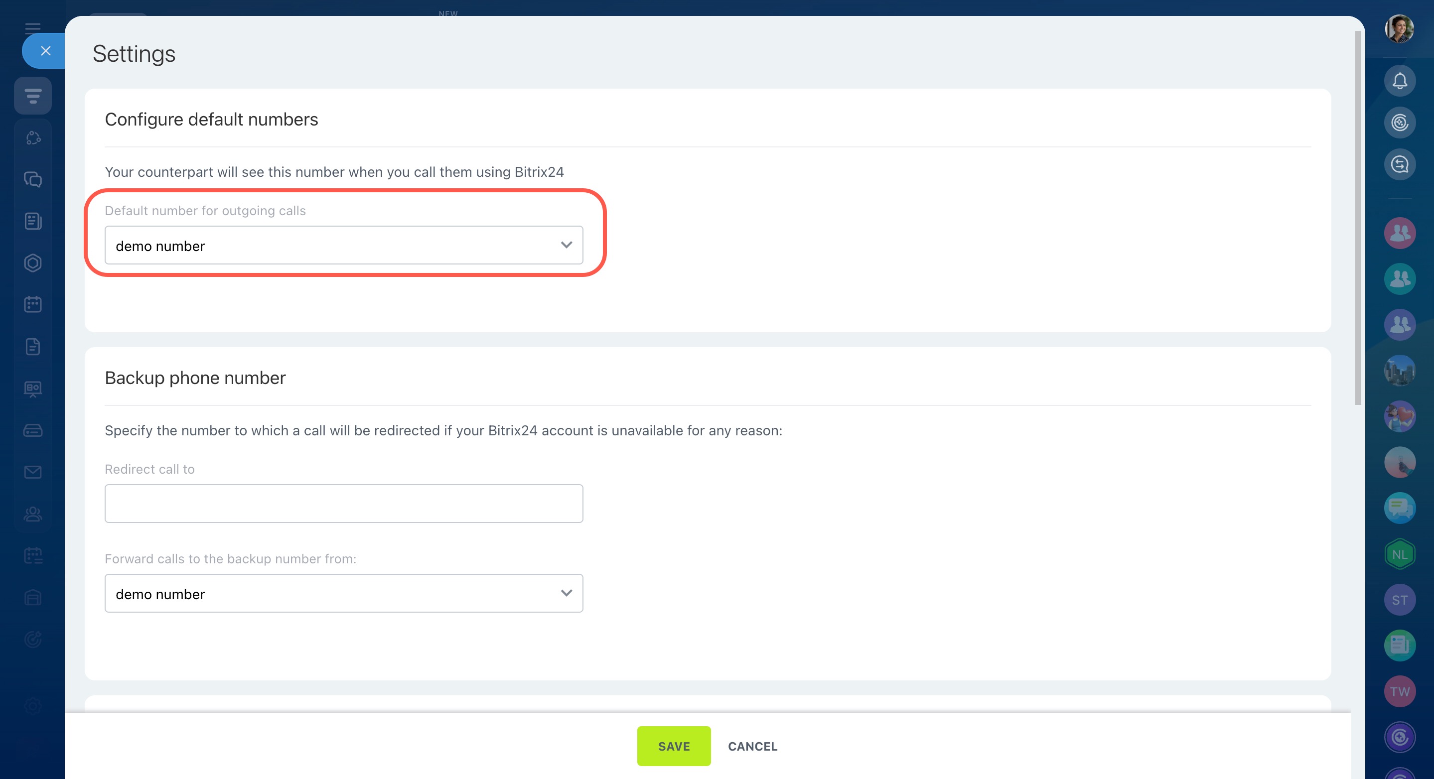 Employees can make outgoing calls from the number specified in the Telephony user settings. This number can coincide with the number selected as the default number for the entire Bitrix24 in Telephony settings.