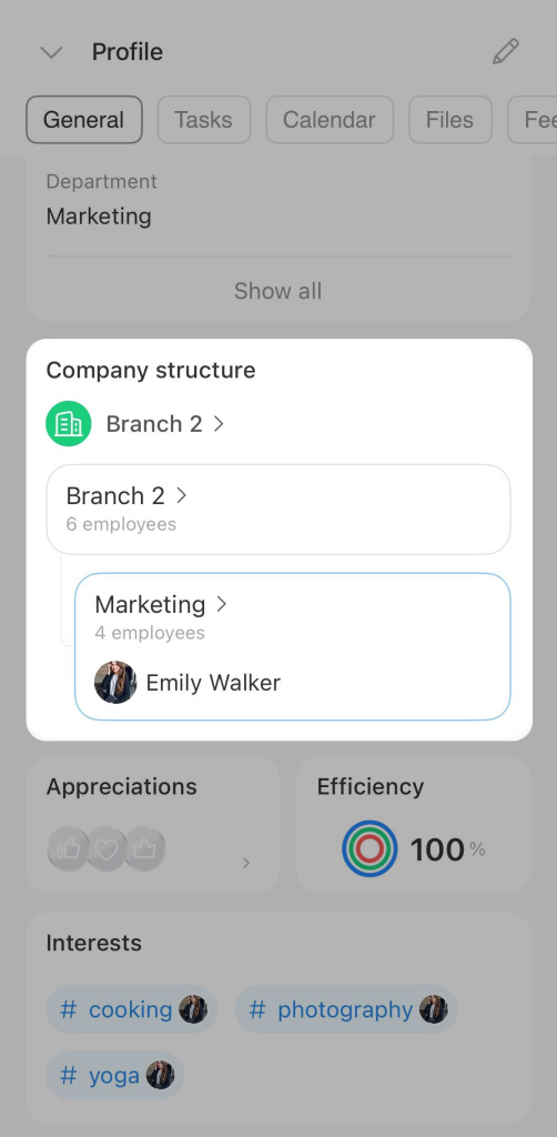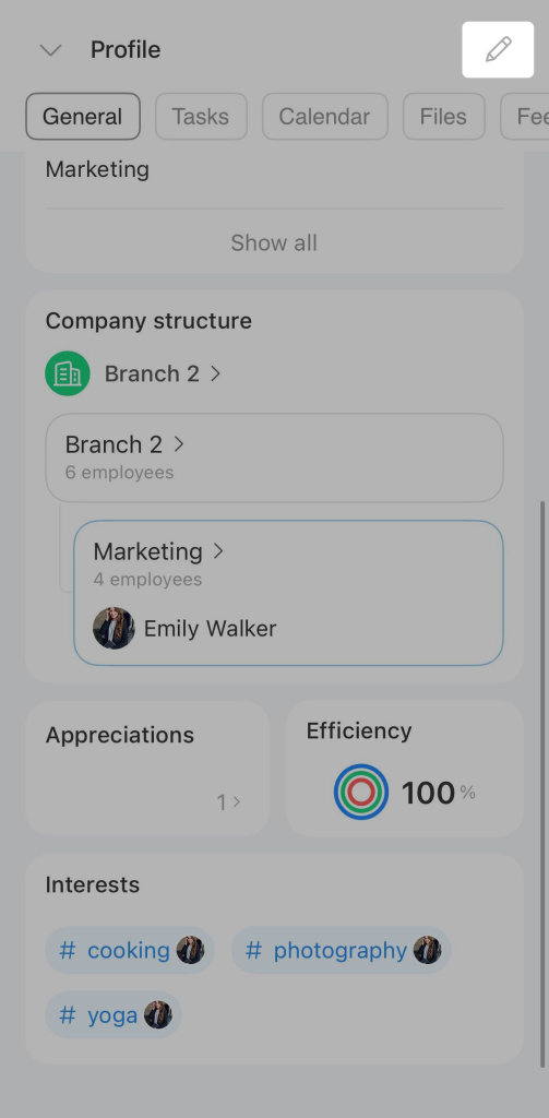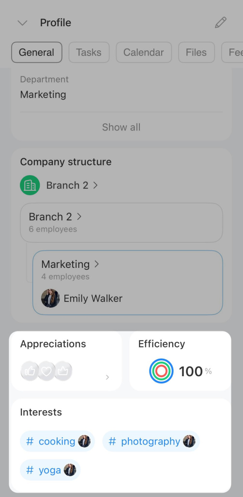 Interests. Employees can add hashtags with topics they like, such as #movies, #travel, #sports, and find like-minded colleagues.