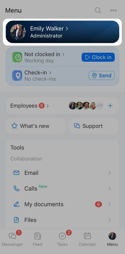 Bitrix24 tools. You can quickly access your tasks, calendar, files, and other tools directly from your profile.