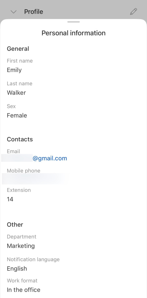 - The profile displays contact information, the employee's photo, the role in the company, status, interests, etc.