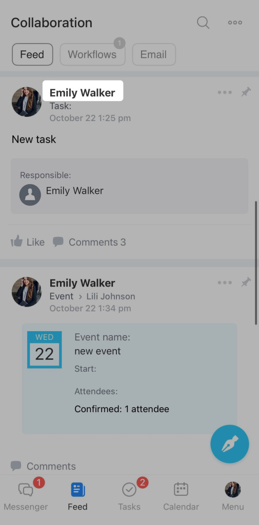 - You can access an employee's profile from any Bitrix24 tool by clicking on the photo.
