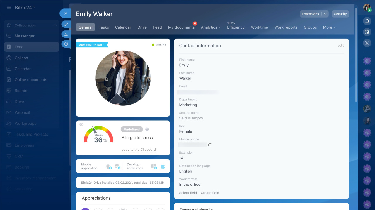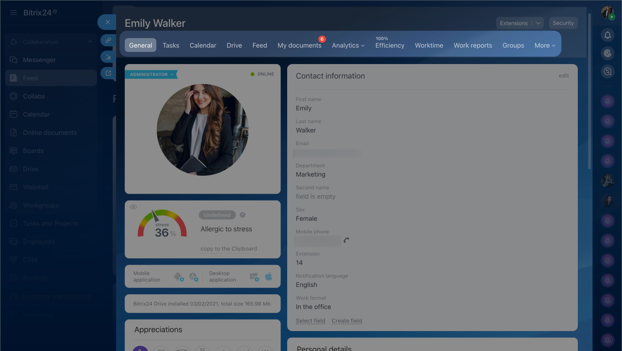 Installed apps. You can check if Bitrix24 apps for desktop and mobile are installed. If not, you can download them directly from the profile.