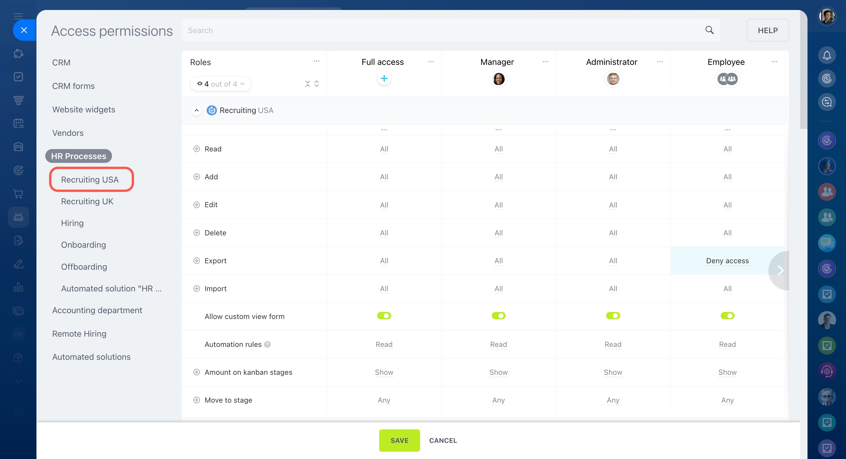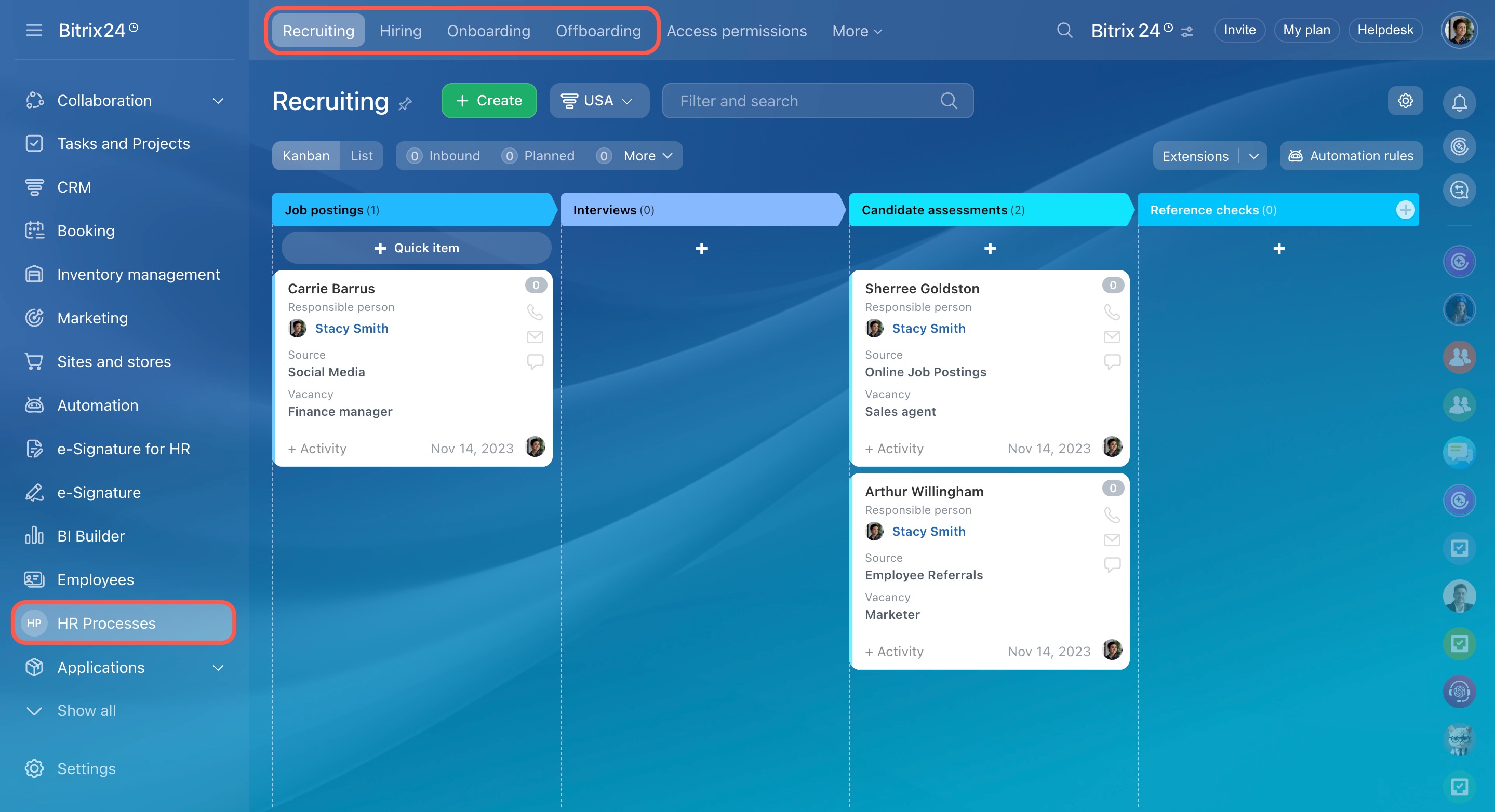 You can create an automated solution for any department. Configure access permissions to the employees who work with the processes. For example, automate various HR processes like recruiting, hiring, onboarding, and offboarding.