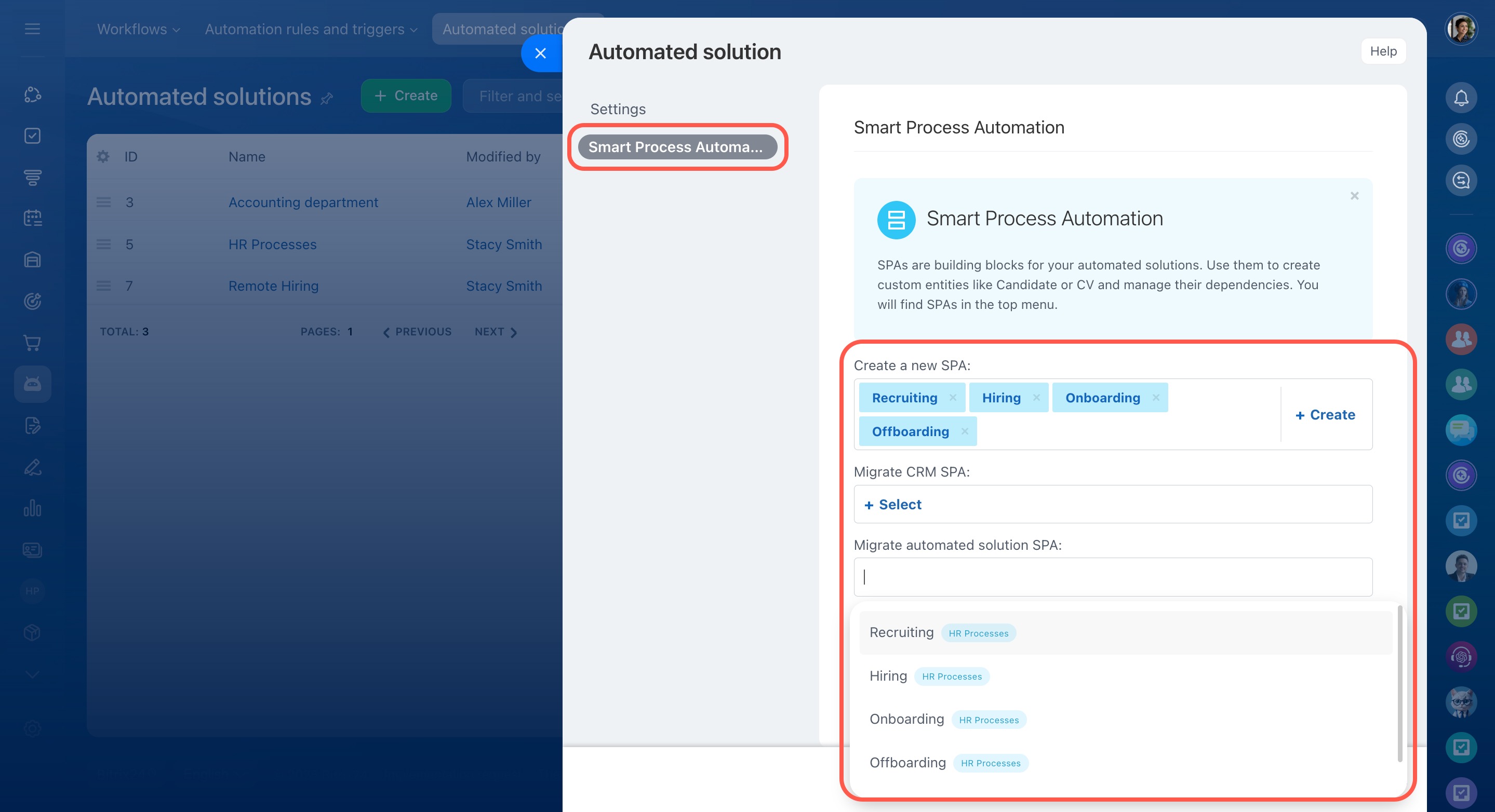 Link SPA to the solution. Open the Smart Process Automation tab in the automated solution settings. Create a new SPA or migrate one from CRM or other solutions.