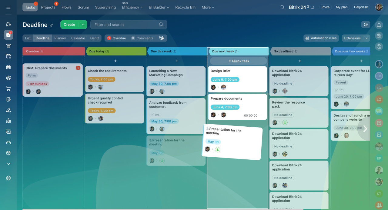 - Bitrix24 has several task planning views. The Deadline view is available in the web version and mobile app.
