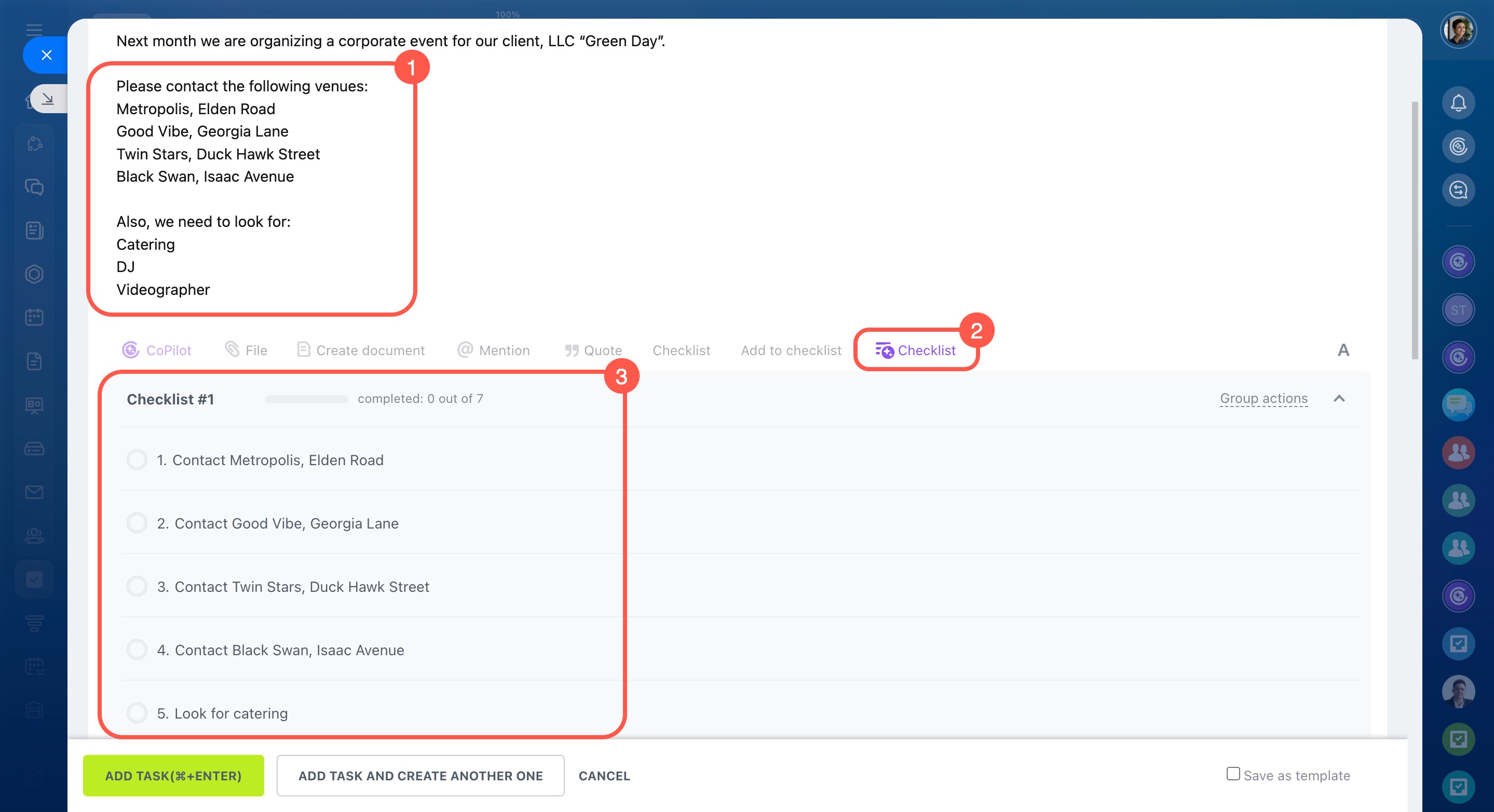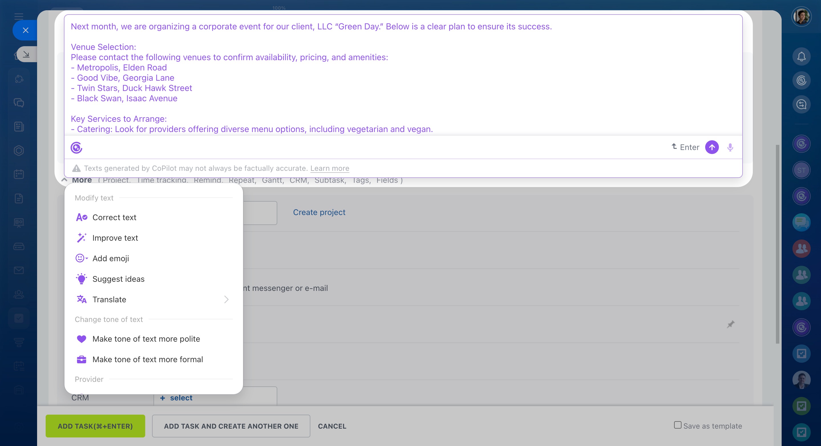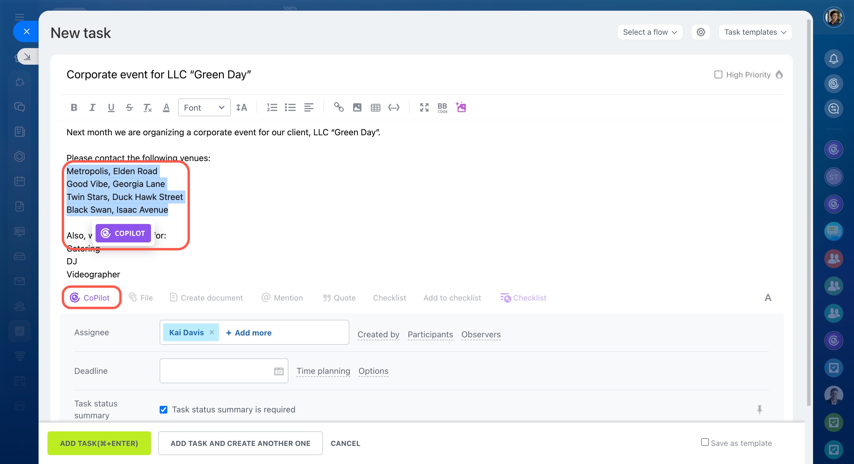 The main advantage of using CoPilot in tasks is the option of making checklists in one click. There's no need to distribute information manually and worry about missing anything. Provide some essential details and allow CoPilot to create a checklist for the task.