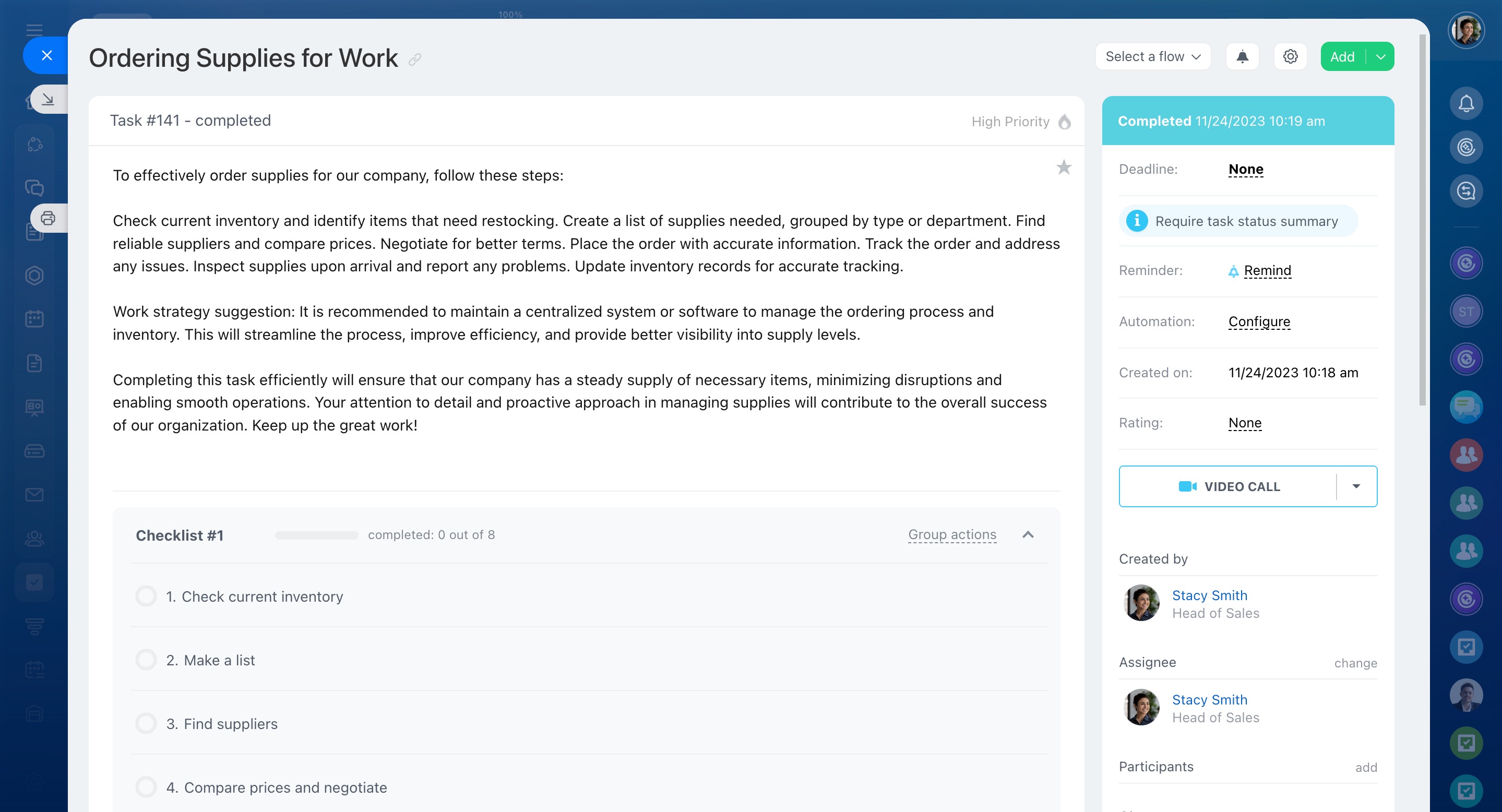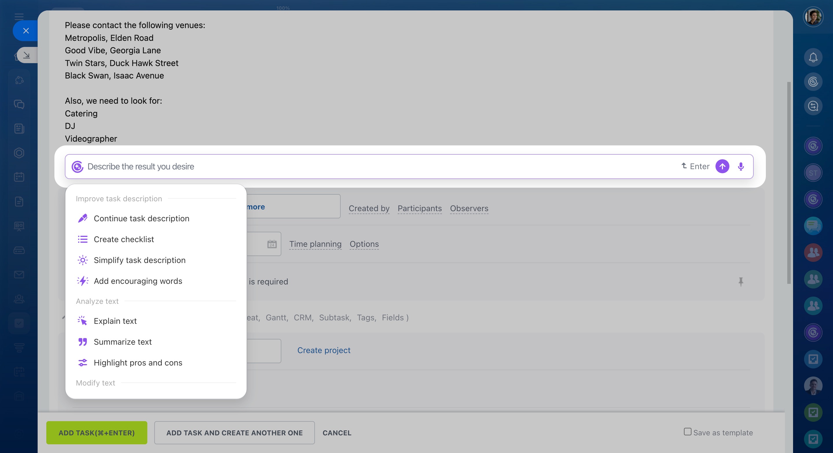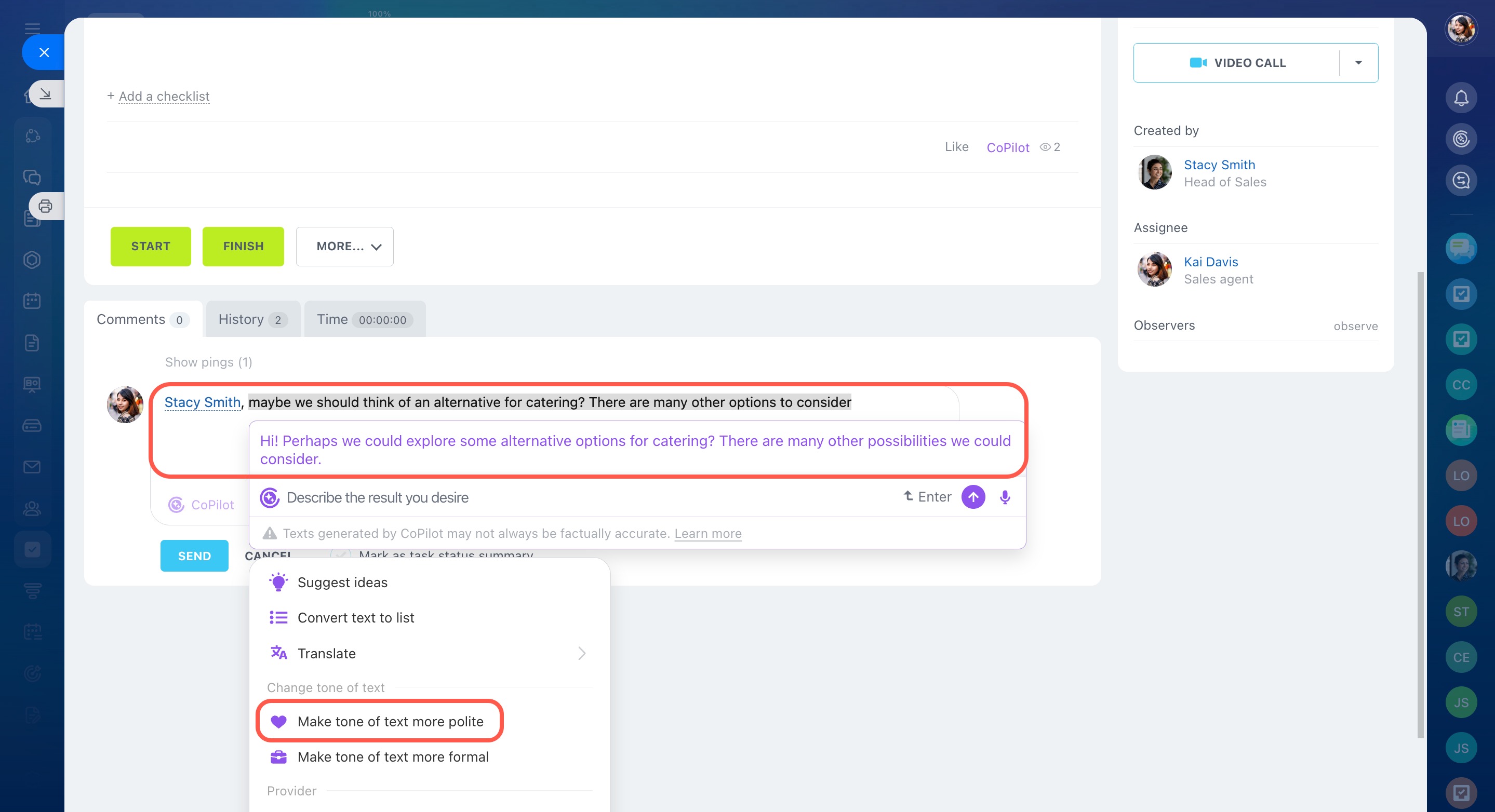 The main advantage of using CoPilot in tasks is the option of making checklists in one click. There's no need to distribute information manually and worry about missing anything. Provide some essential details and allow CoPilot to create a checklist for the task.