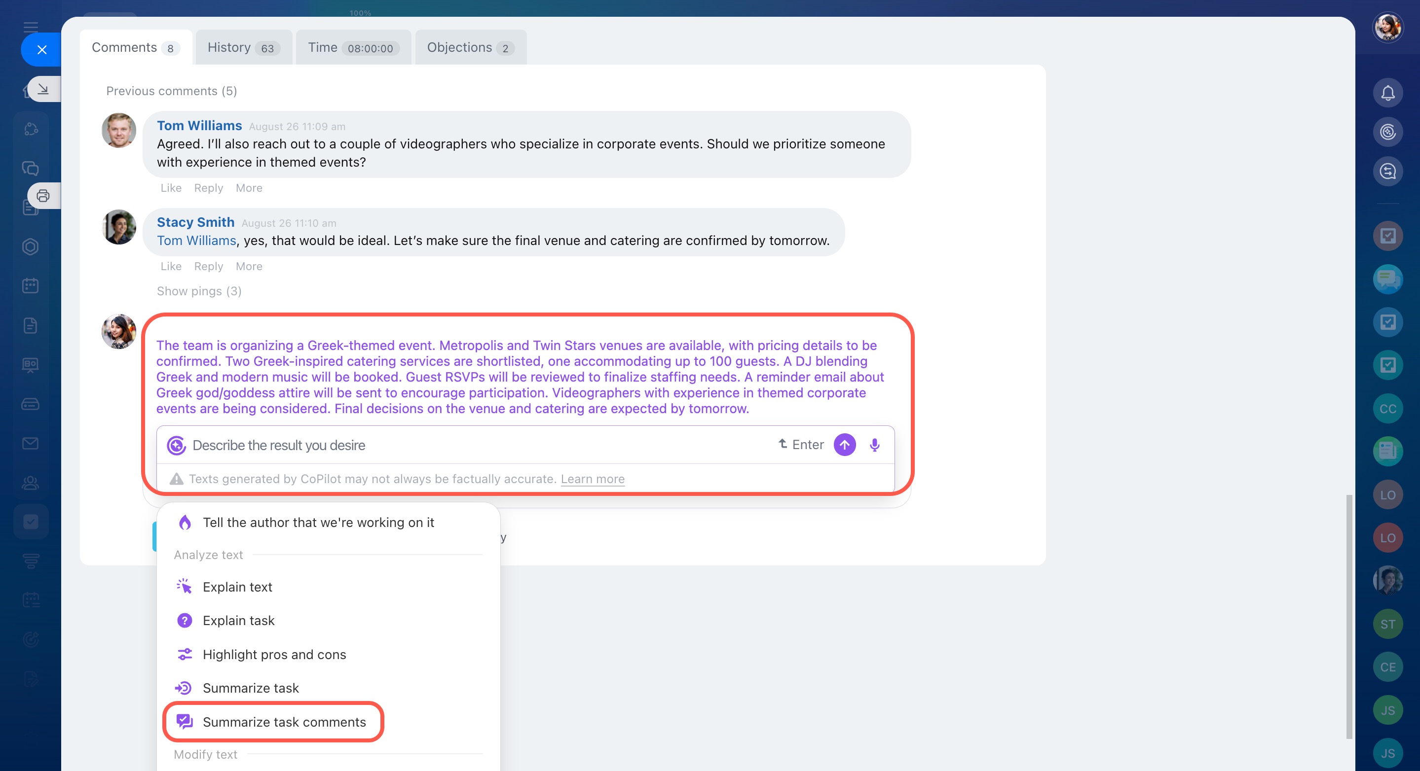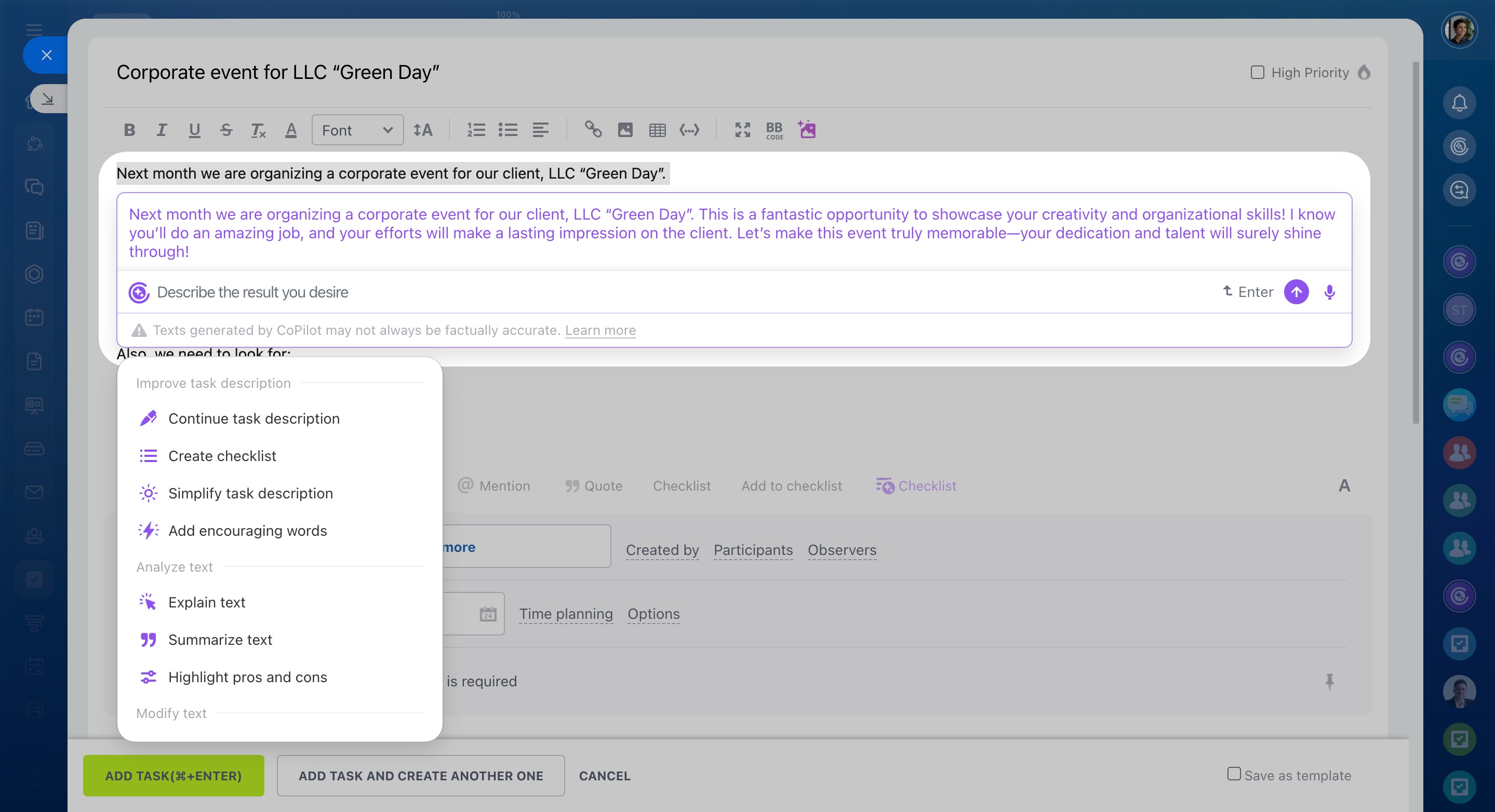 Analyze text. With CoPilot, you can highlight the main points of the task or comments, explain the task details, and find out its pros and cons.
