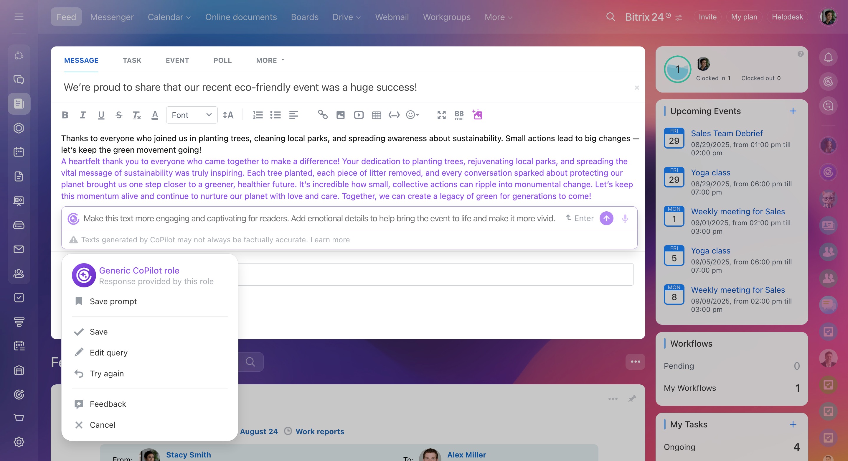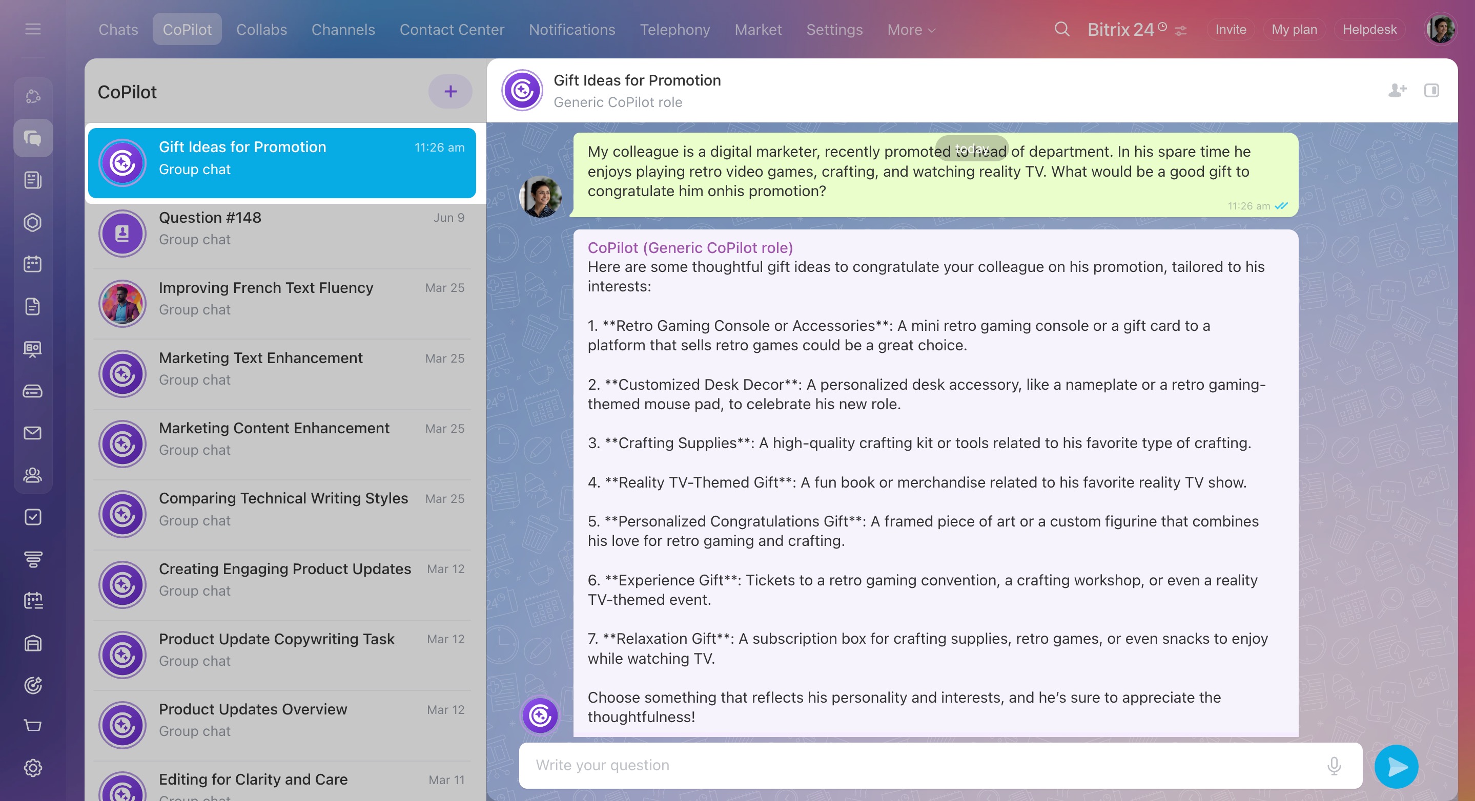 As a part of the Bitrix24 Vega release, we added CoPilot to Feed, Tasks, and CRM. It is also integrated into our new chat. This AI assistant will save your time on writing texts, processing customer calls, and adding tasks, allowing you to focus on more important things.