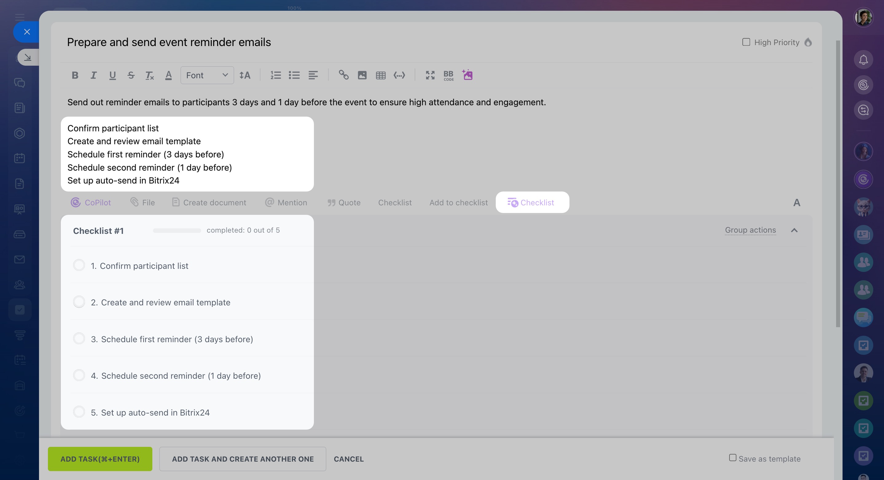 The main advantage of using CoPilot in tasks is the option of making checklists in one click. There's no need to distribute information manually and worry about missing anything. Provide some essential data and allow CoPilot to create a checklist for the task.